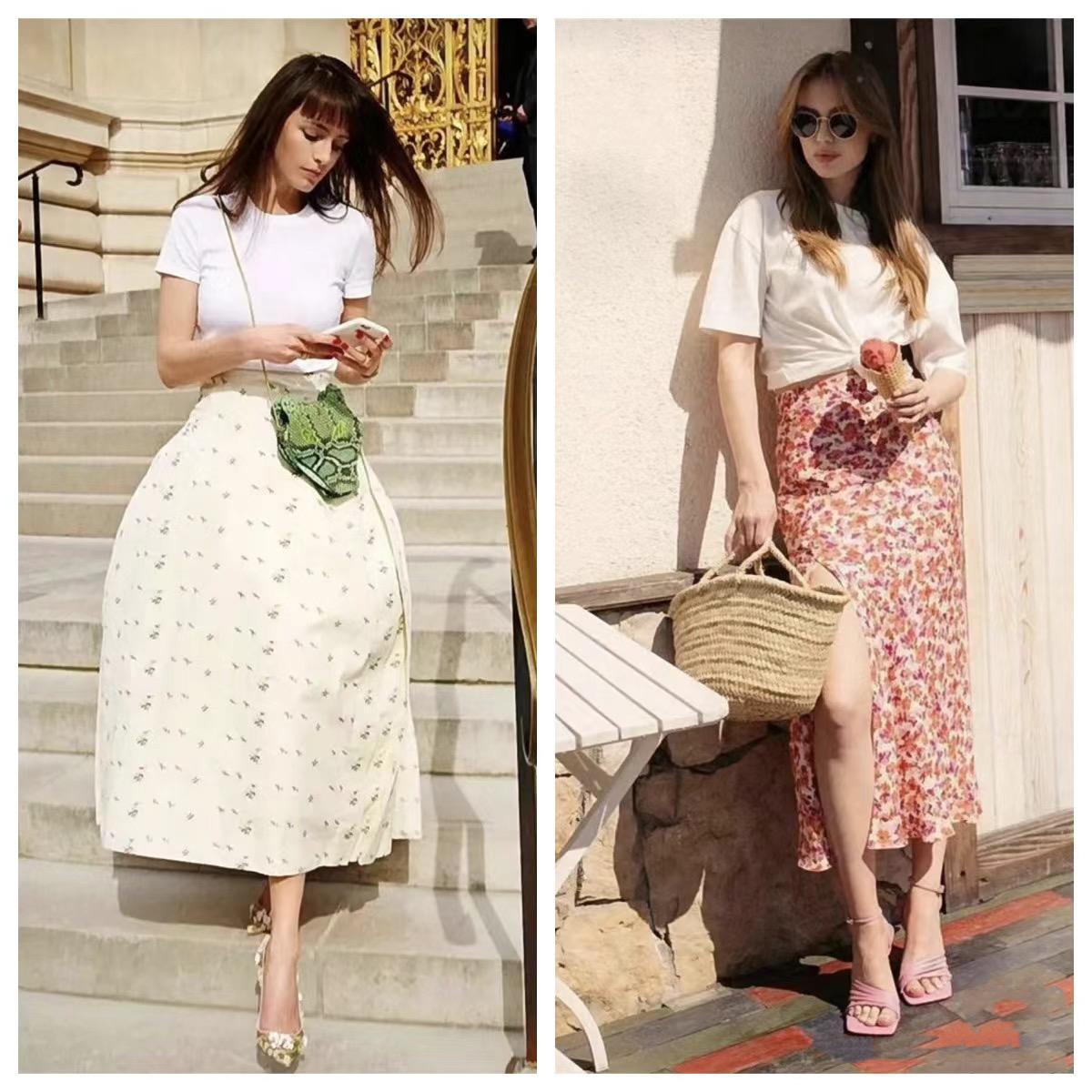 白T+印花半身裙,擁有更浪漫且高級的自由。