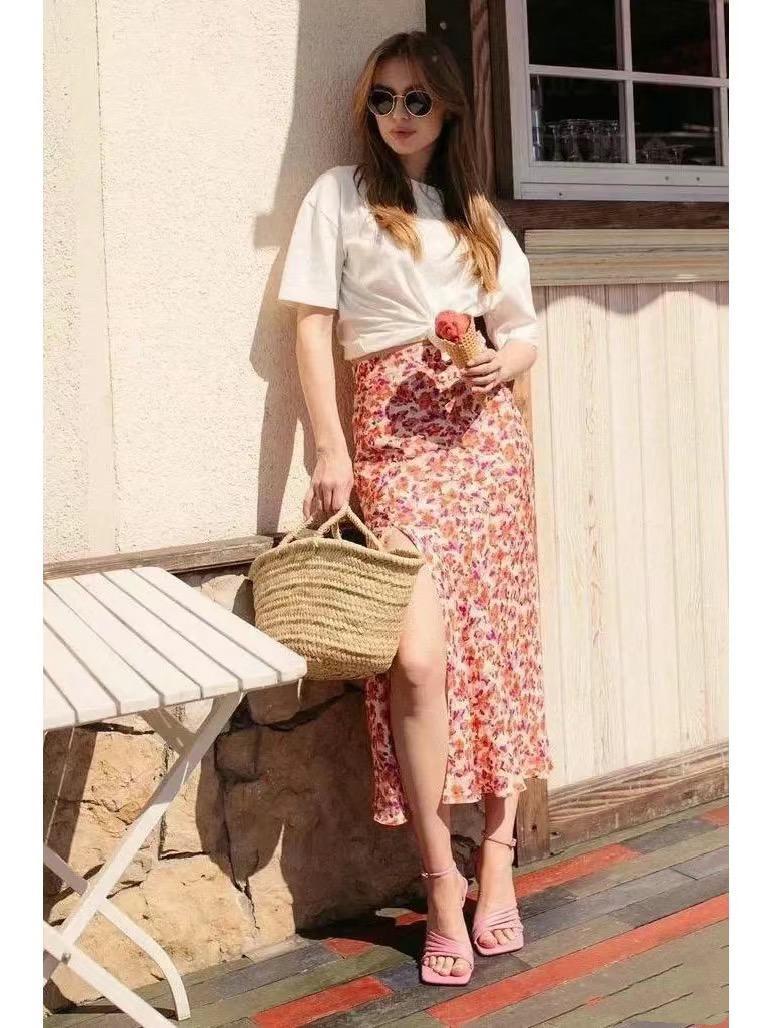 我們可以用印花半身裙,來搭配白色T恤穿着。