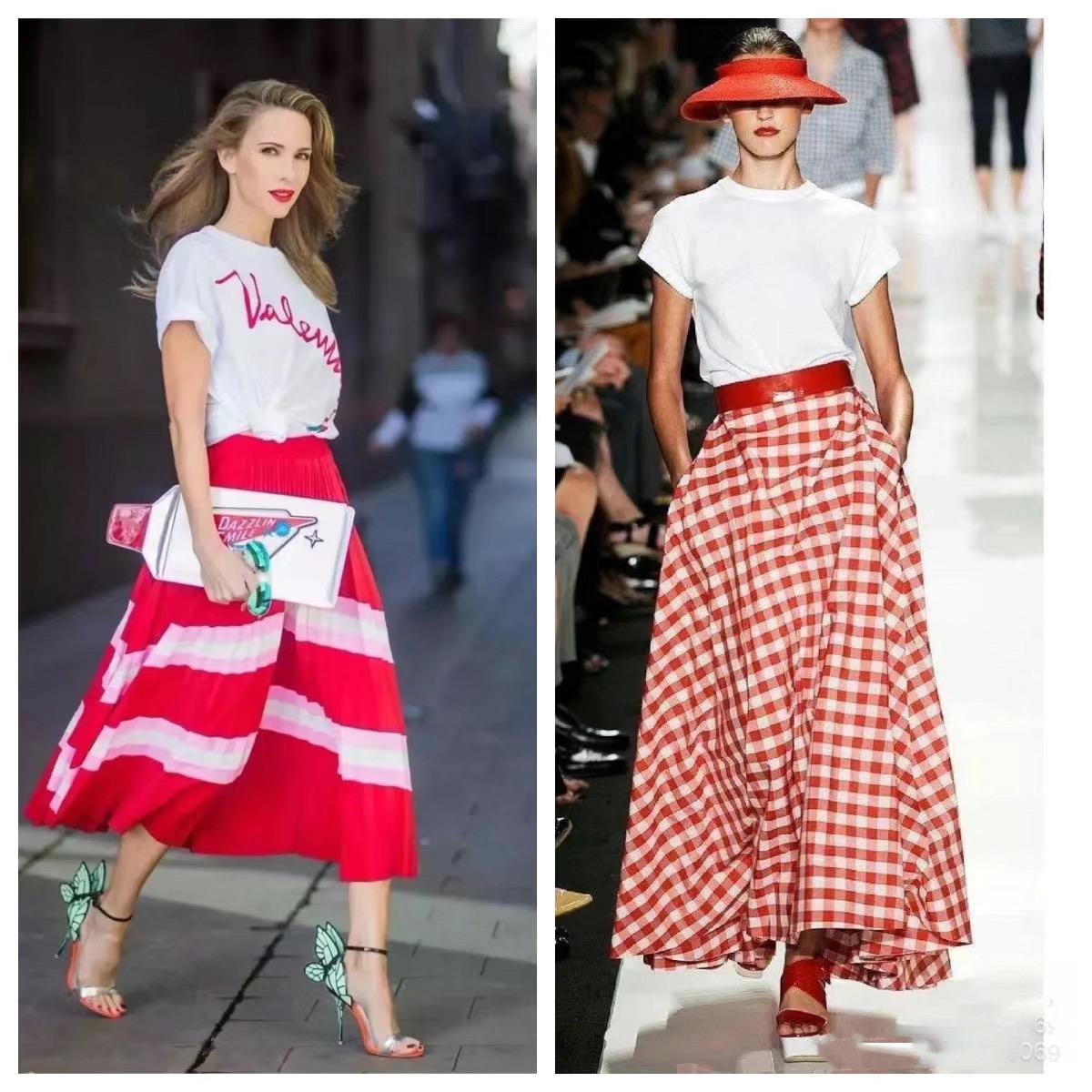 紅白撞色的條紋或者格子半身裙,配上白色T恤也是醒目又明豔。