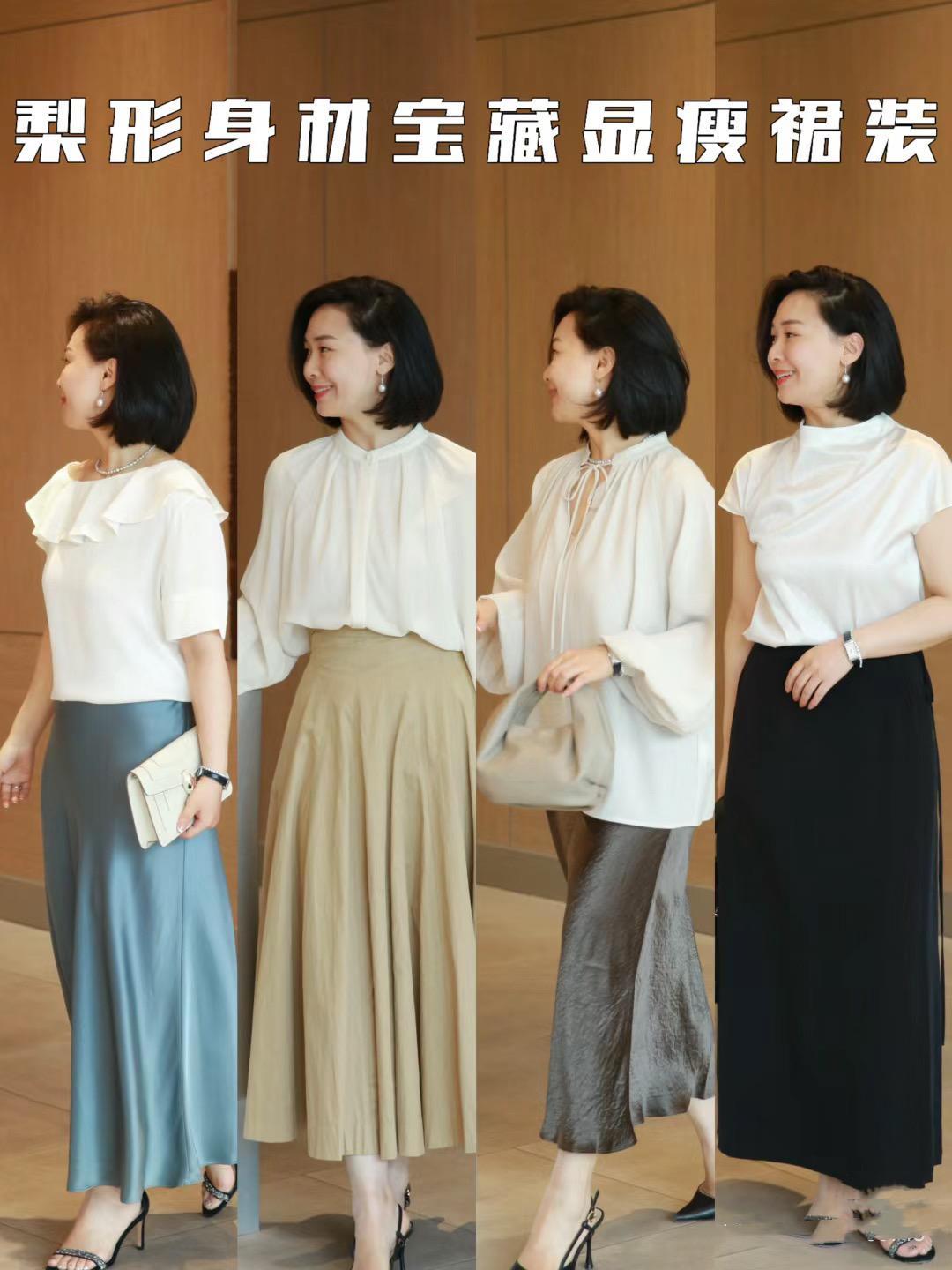 面料細膩的襯衫,配挺闊的闊腿褲,半身裙,也更適合梨形身材。
