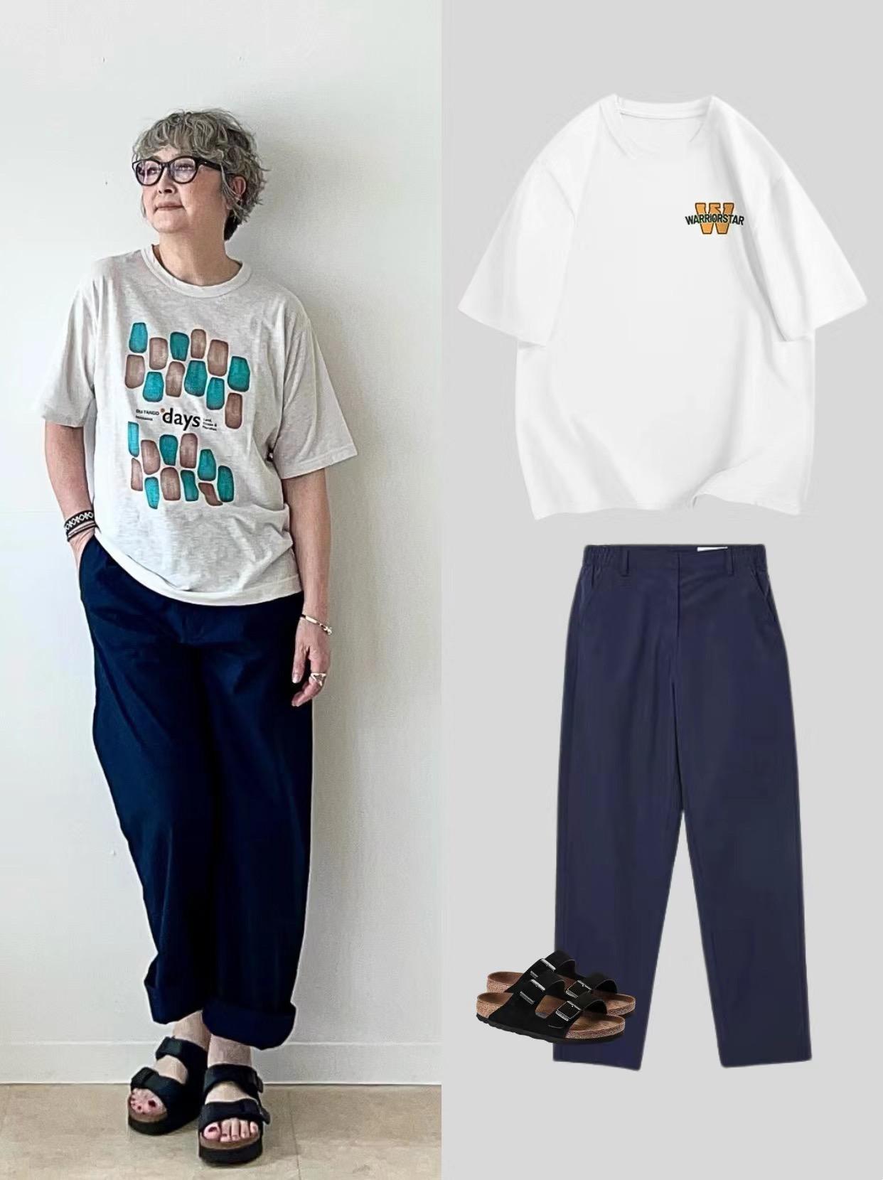 寬鬆的大地色T恤,與60+女性的溫和美更適配度更高。