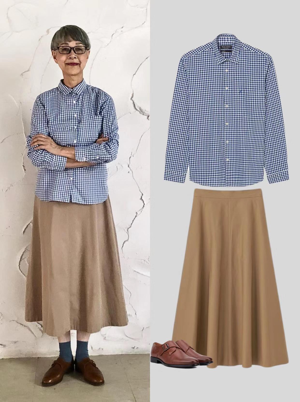 藍白格子襯衫,搭卡其色半身裙、棕色皮鞋,上班通勤也很有腔調。