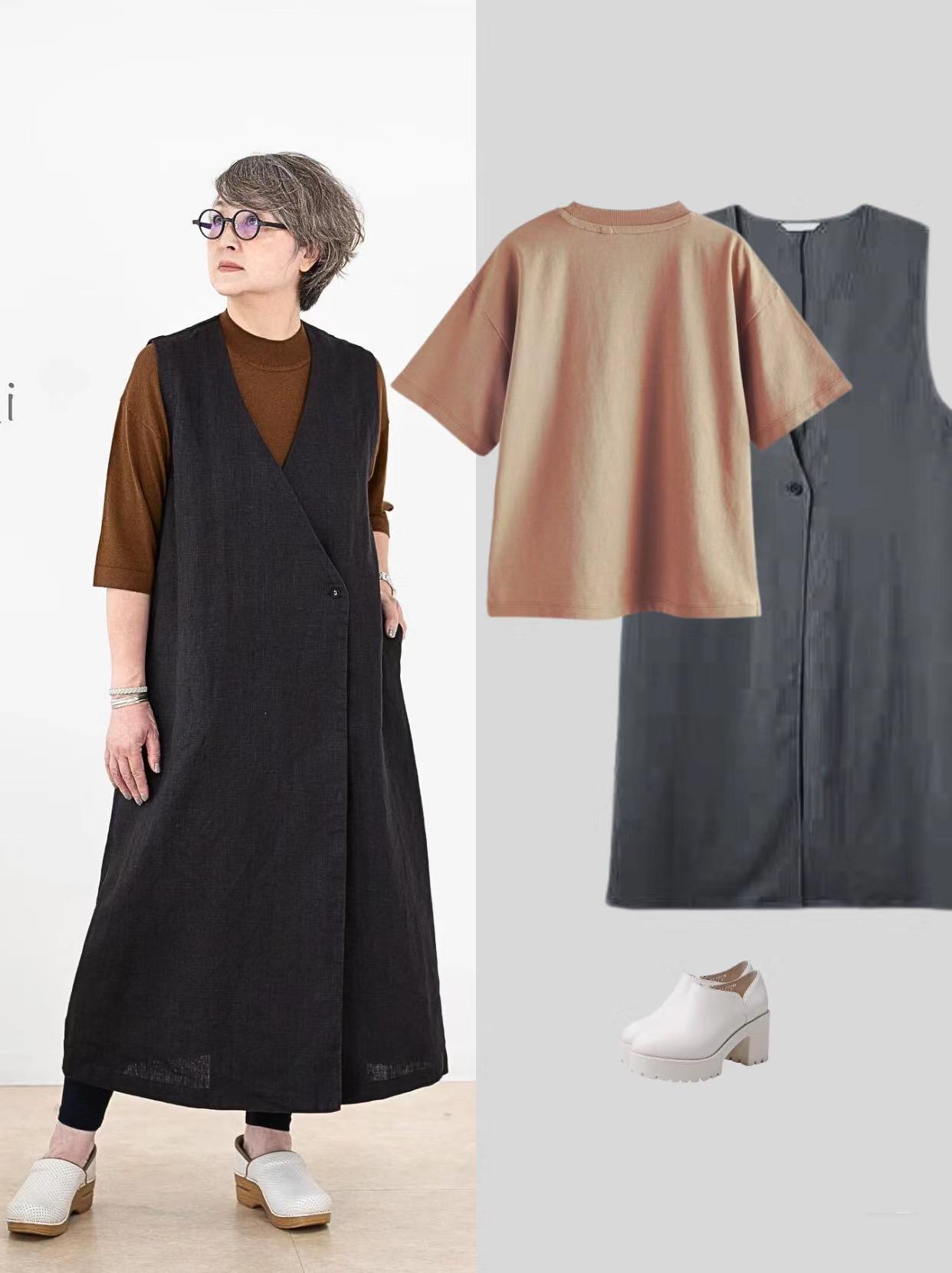 比如寬鬆的T恤,可以配長款的馬甲連衣裙來穿着。
