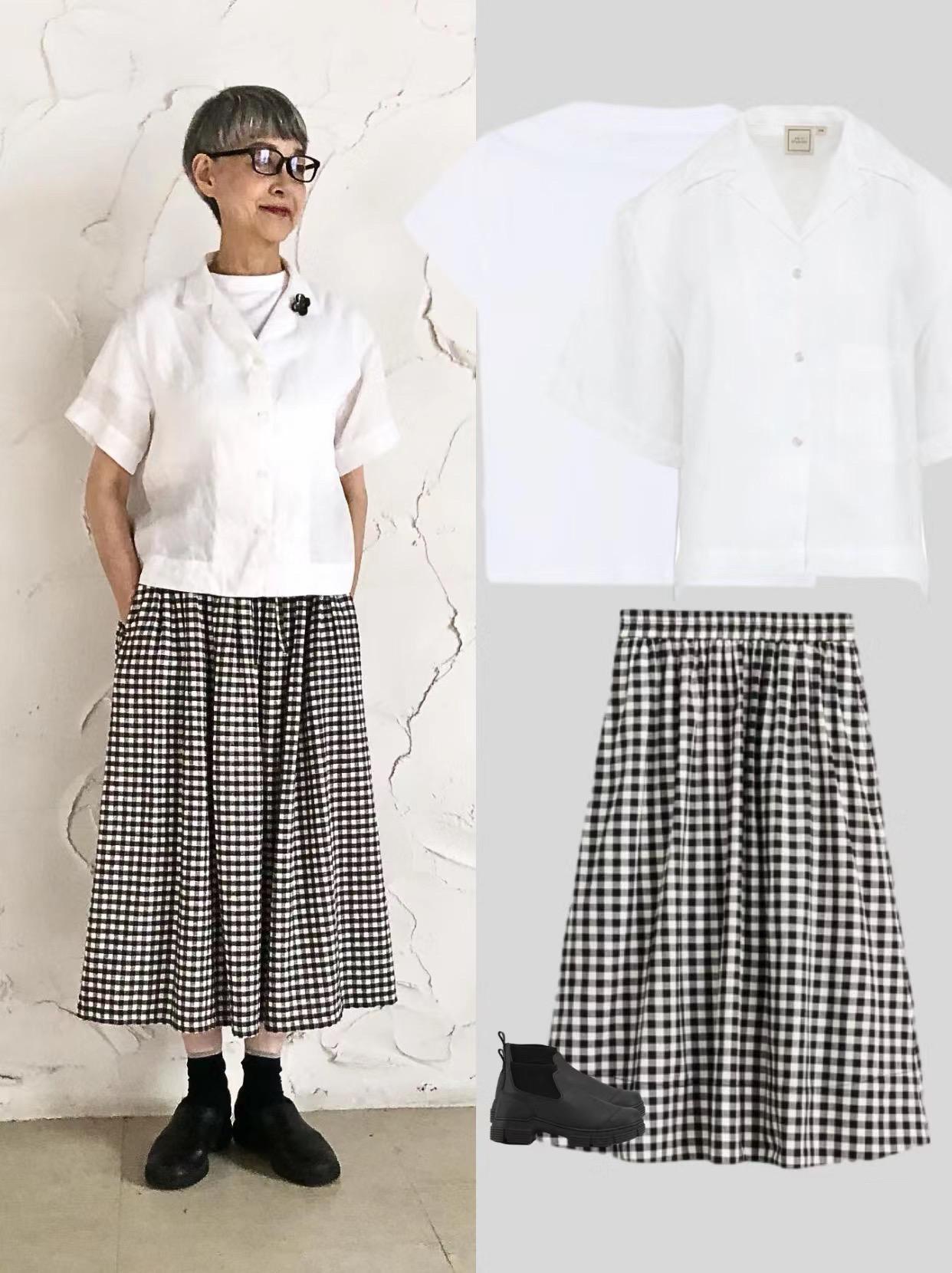 黑白格子半身裙,配白襯衫、黑皮鞋,起到了承上啓下的效果。