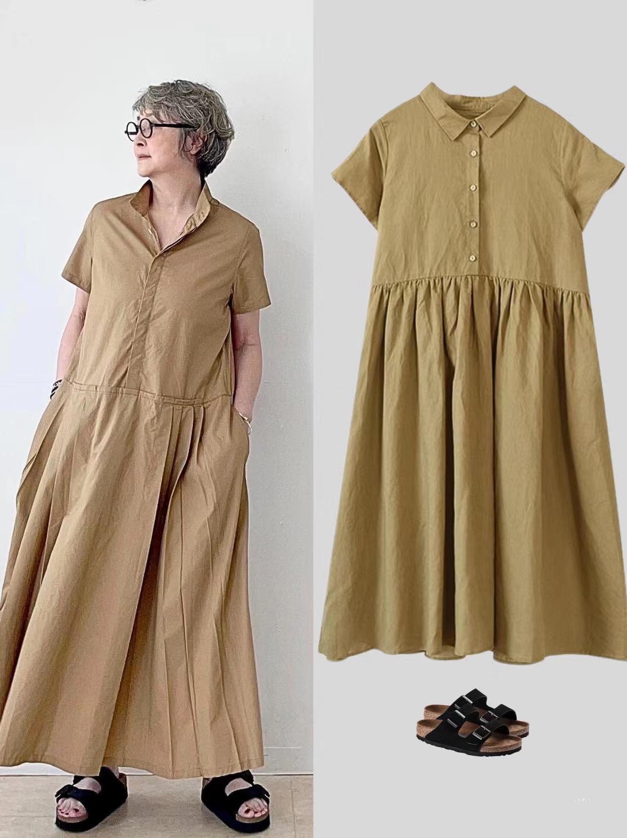 卡其色的娃娃裙,大裙襬的剪裁,更舒適且具備了包容性。