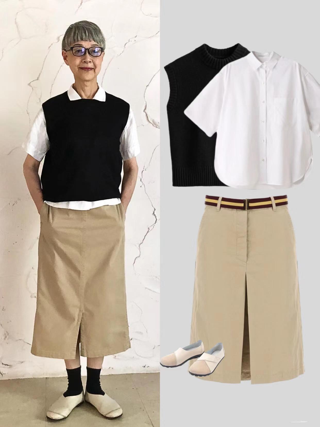 白襯衫+黑馬甲,依然是配卡其色半身裙,簡約復古、文藝氛圍拉滿。