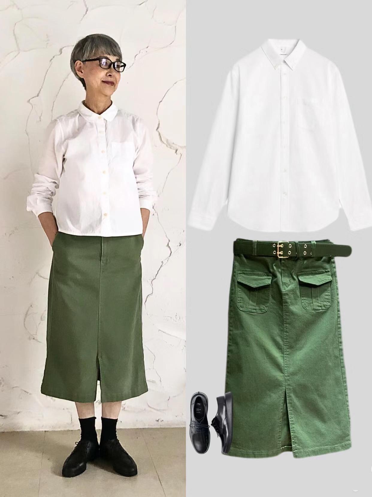用版型挺闊的白襯衫,配高腰的半身裙,簡潔又流暢。白襯衫撞上軍綠色,也是高級又顯白的。