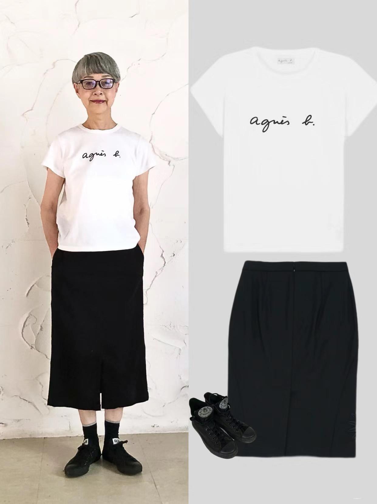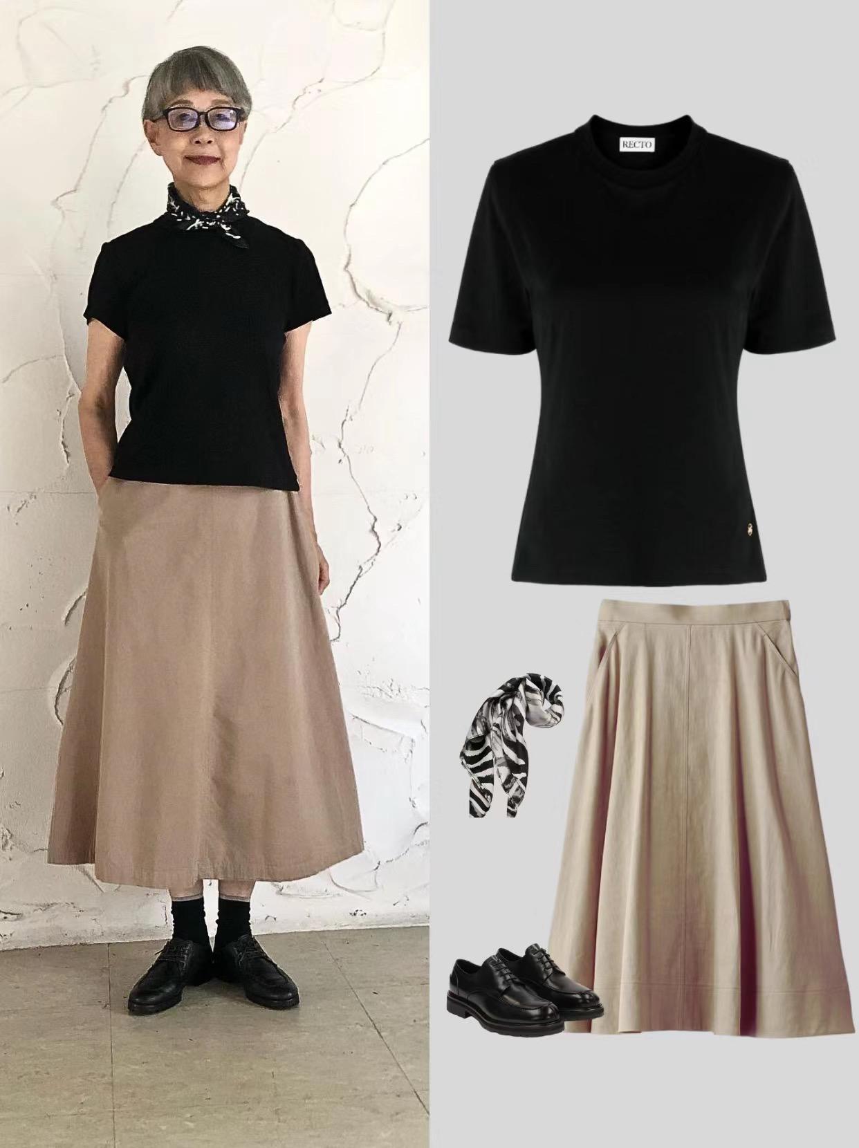 穿不膩的白T恤,只需要配黑色半身裙,就清爽減齡。