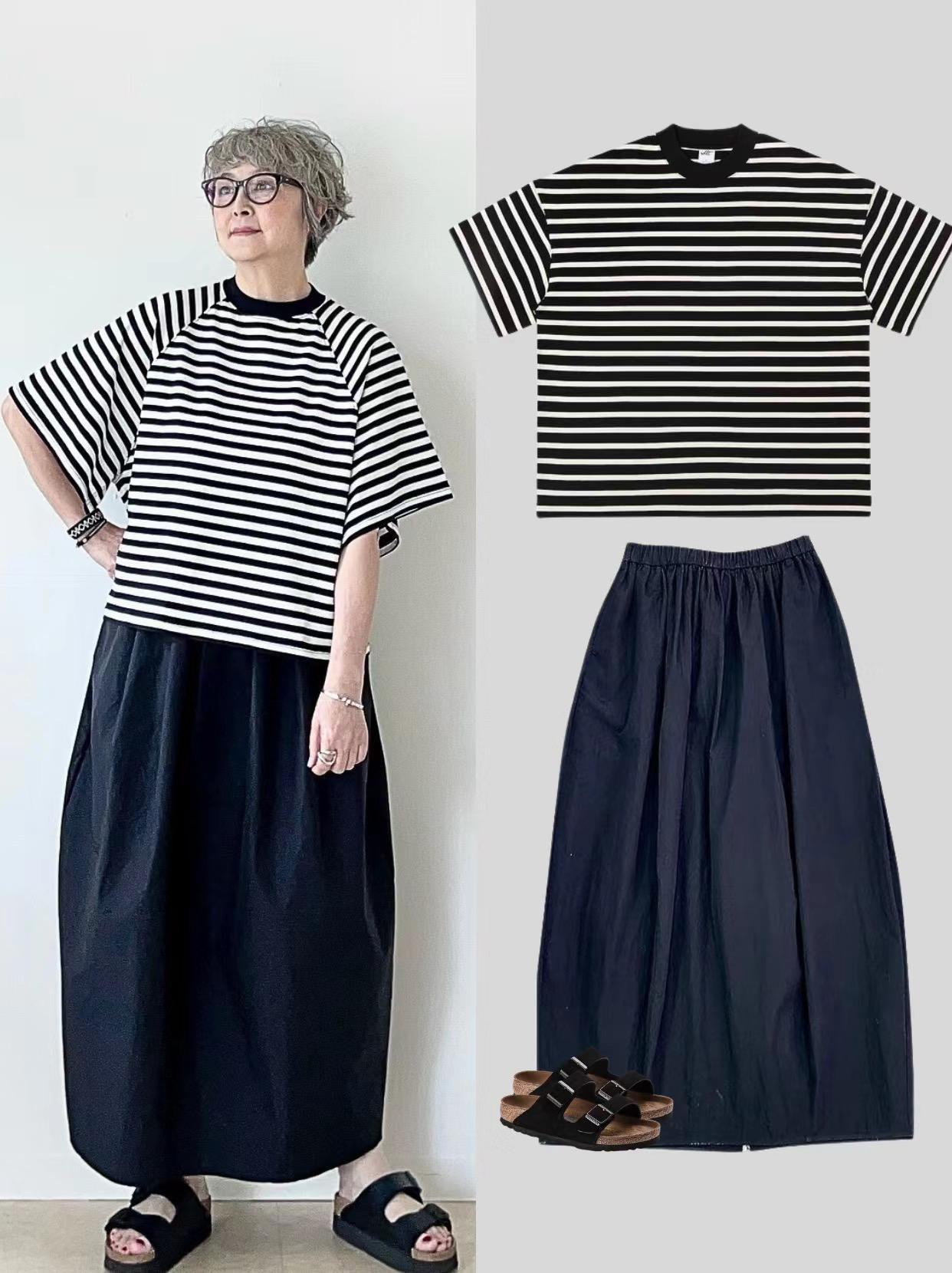 條紋T恤,可以配寬鬆的燈籠裙,即便是發福的身材、也可以完美掩蓋。