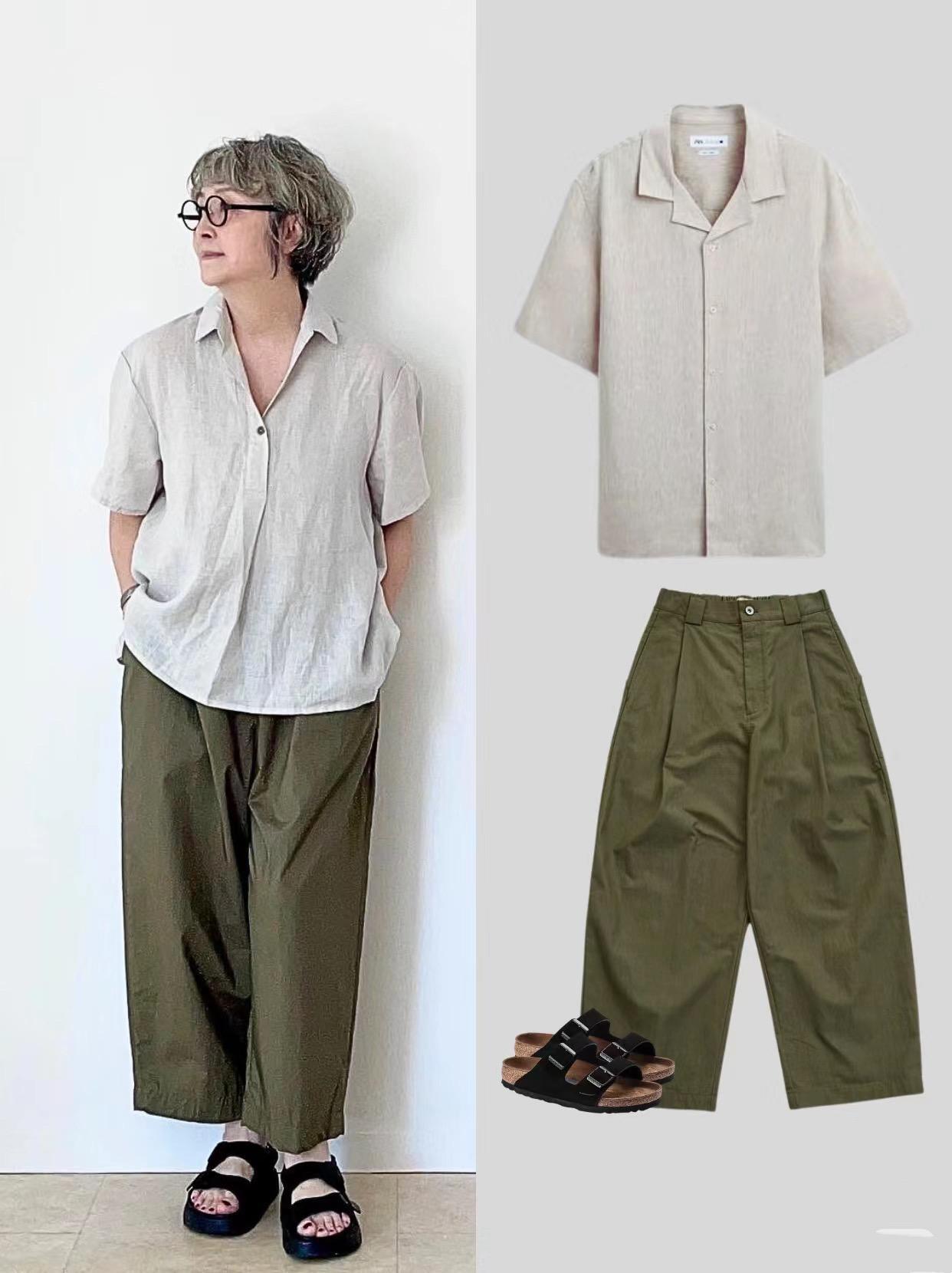 用亞麻襯衫來搭配軍綠色的闊腿褲,有一種簡單且清爽的美。