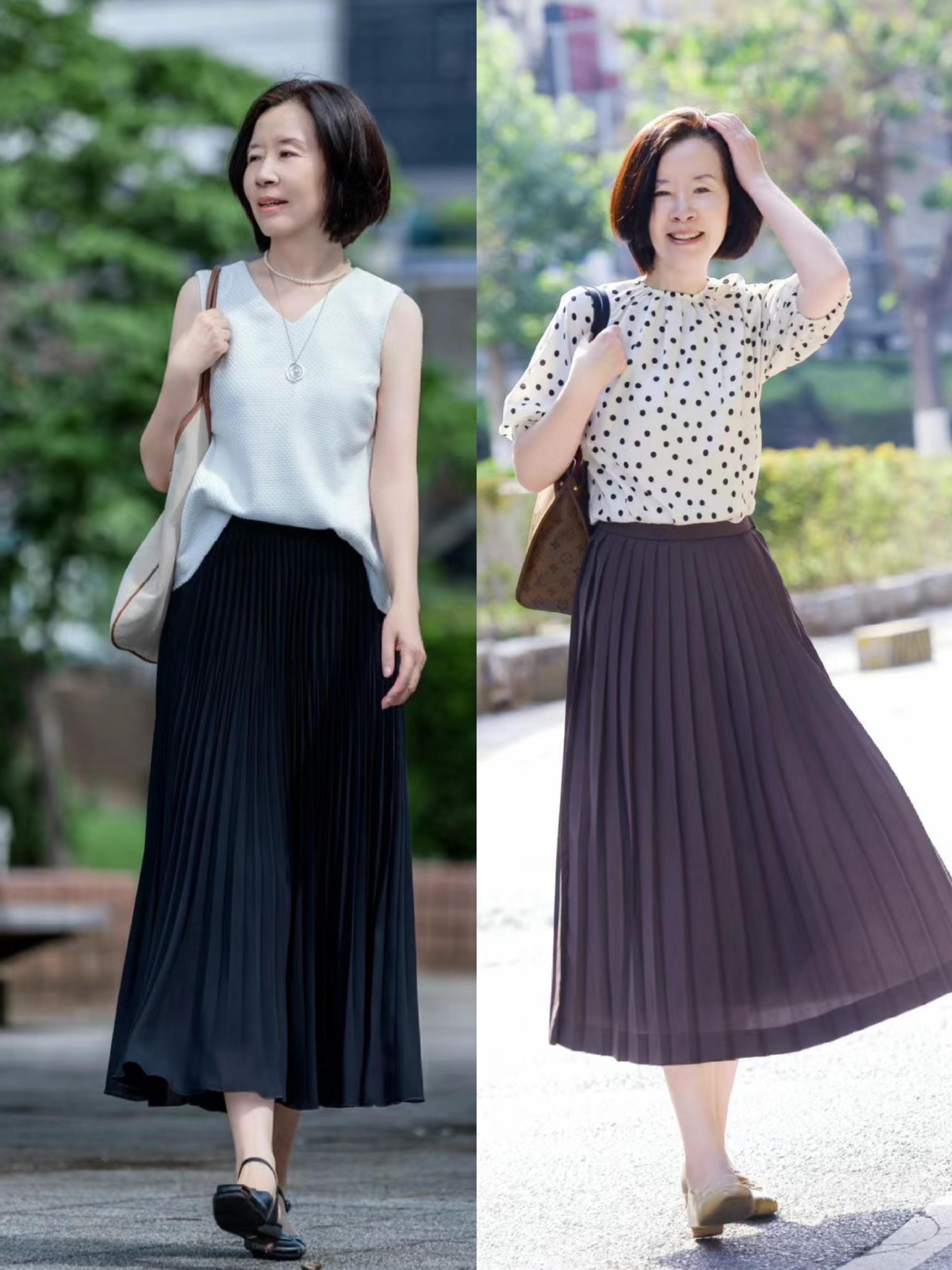 波點元素的襯衫,我們可以配百褶半身裙。簡約不單調,洋氣又遮肉的穿搭,才更符合中年女性的定位,百褶半身裙細膩浪漫、很是顯瘦。