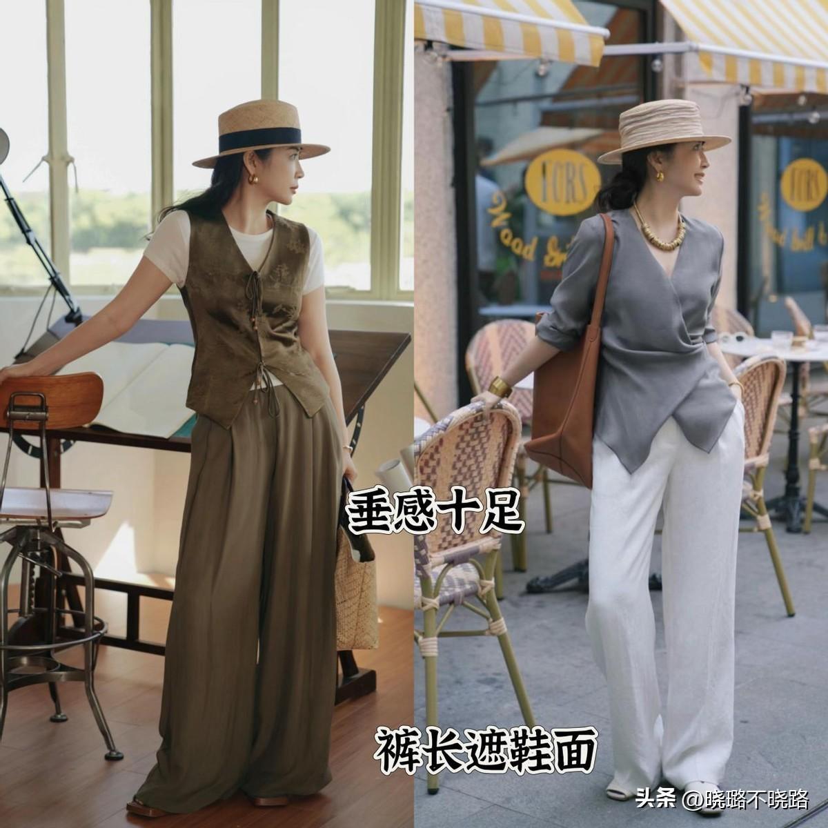 夏日挑選長褲,應當優先選擇垂感好的冰絲、亞麻或者西裝料,既能夠延長身形線條,也足夠舒適透氣,配合上遮鞋面的長度,自然更顯腿長。