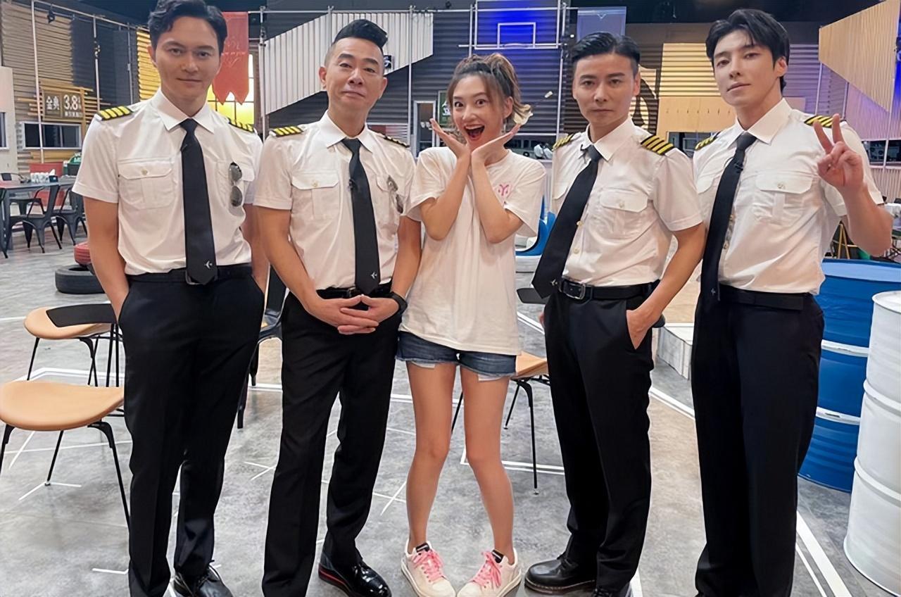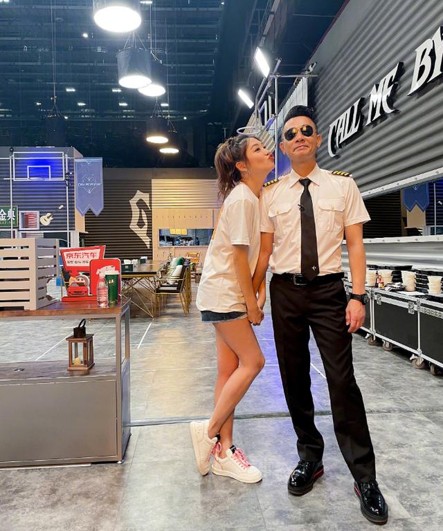 穿襯衫搭配西褲的陳小春,像個帥氣的飛行員,而一旁穿T恤搭配短褲的應採兒,卻像他“女兒”。