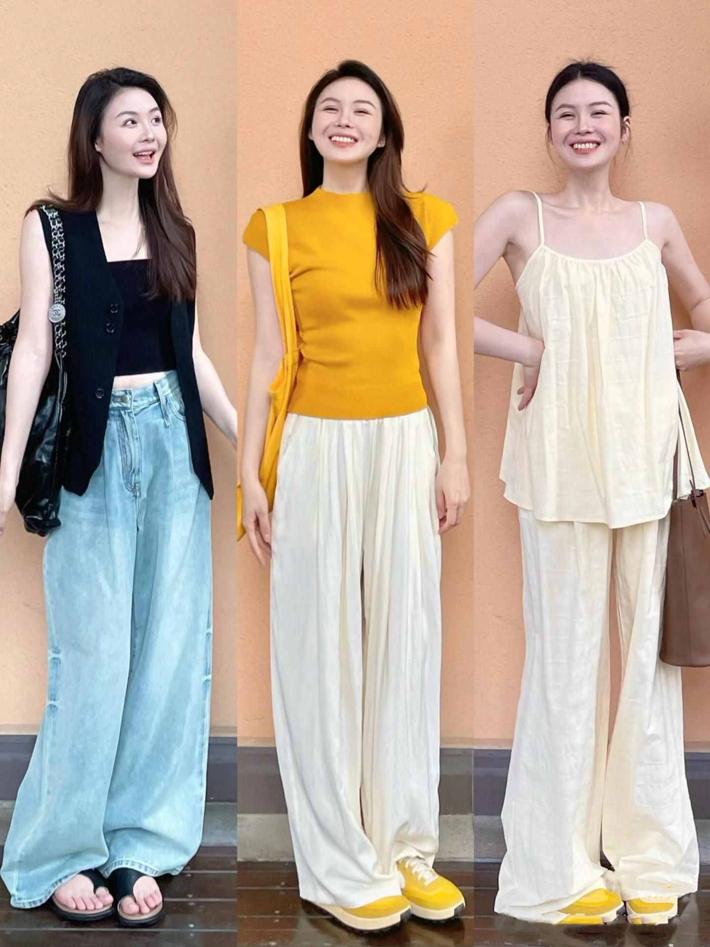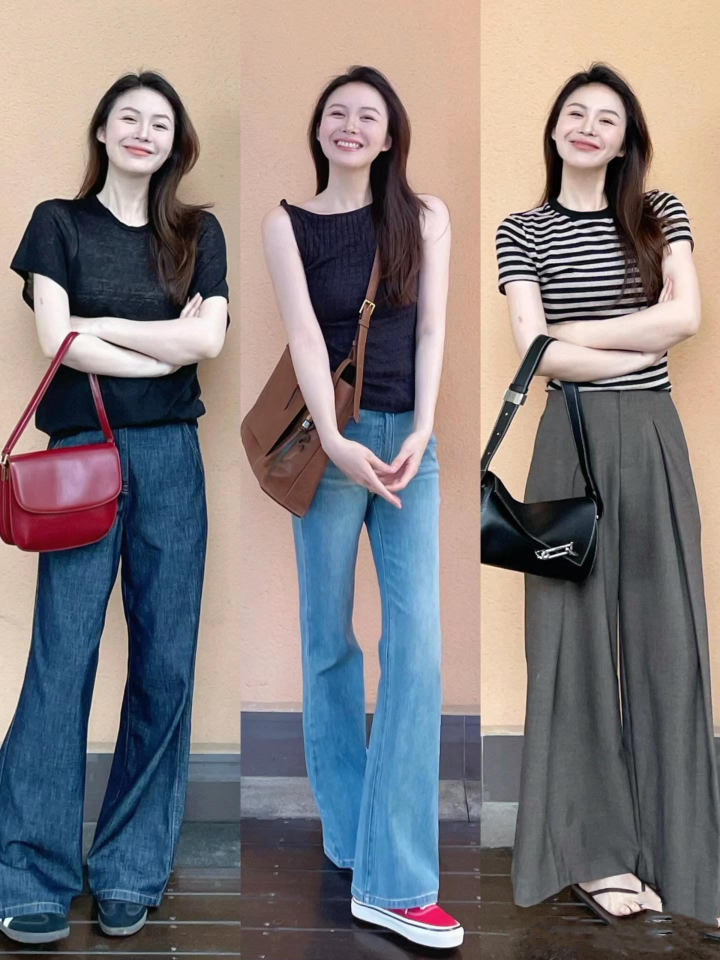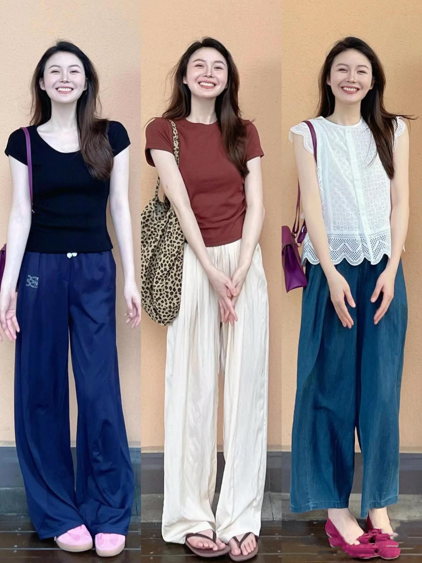 短款收腰的小T恤,可以配高腰的闊腿褲。上短下長、上窄下寬的穿搭,抬高腰線、掩蓋腰胯粗壯、腹部、大腿的肉感,就更加顯瘦顯高。