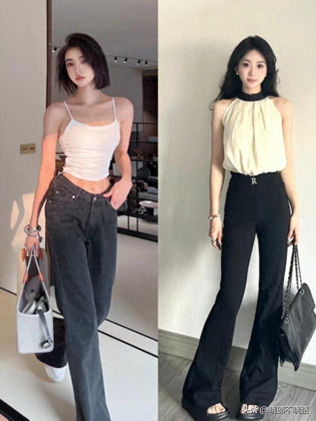 一條馬蹄褲的穿搭很講究顏色的基礎感,褲子本身其實並沒有那些花哨色系作爲混搭,我們只需要讓一黑一白作爲造型的基礎色彩,這樣的配色簡約耐看,上衣的吊帶設計也可以更好的展示出你體型的纖細優越感。