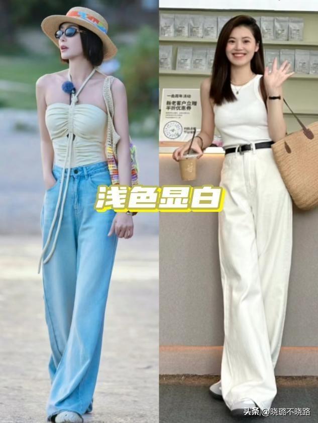 闊腿牛仔褲還可以用來矯正你的腿型,優化你的腿部形狀,比如說我們在穿那種直筒,但是又帶一點點修身感的淺色牛仔褲的時候,其實就可以利用色系的點亮效果,來穿出腿部線條的豐滿感,但是又不至於顯得太胖。