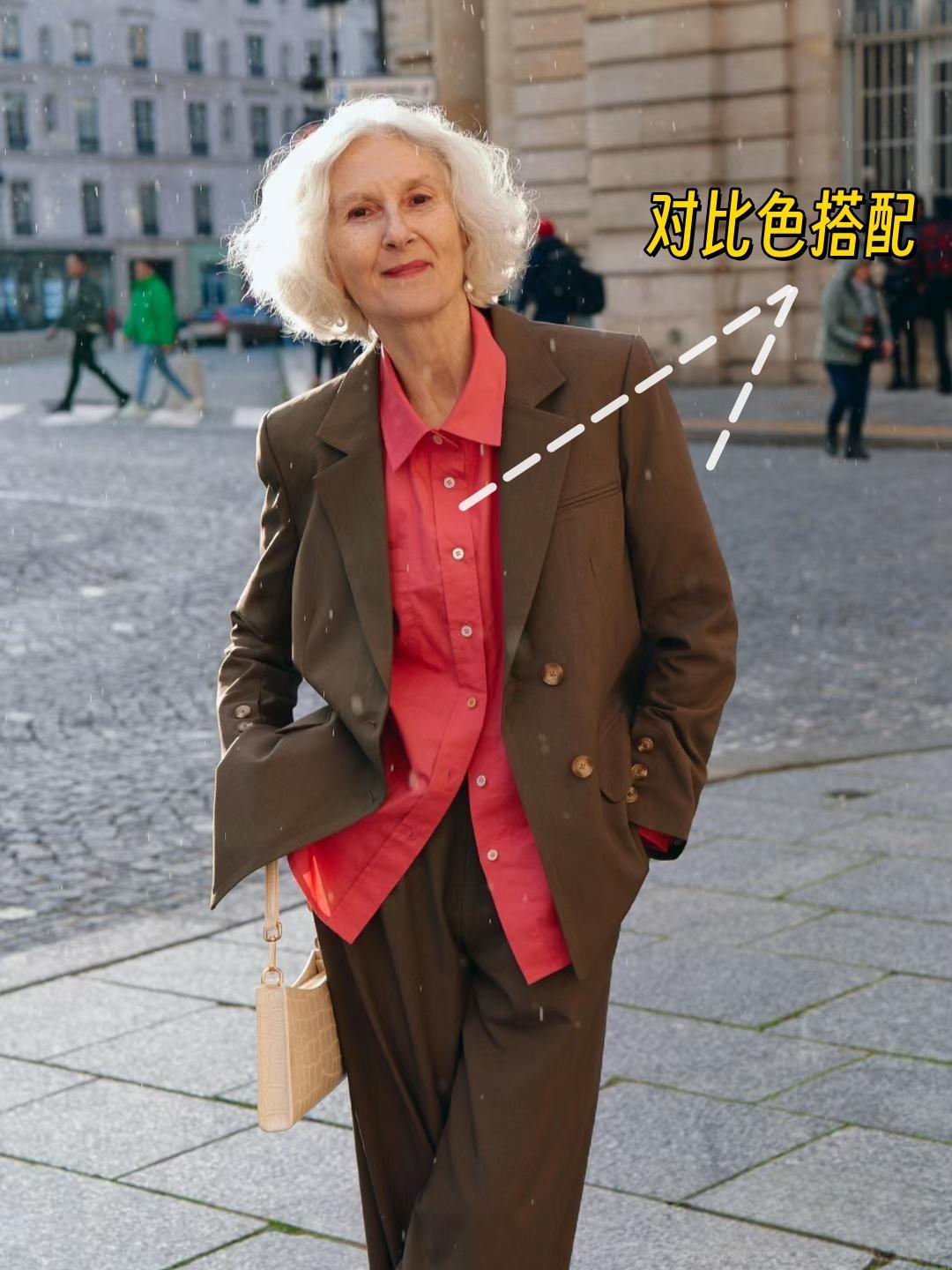 此外,一個亮色的襯衫和西裝搭配真的百搭又自然,結合一頭白髮可以輕鬆點亮整體裝扮,增添春日的活力。