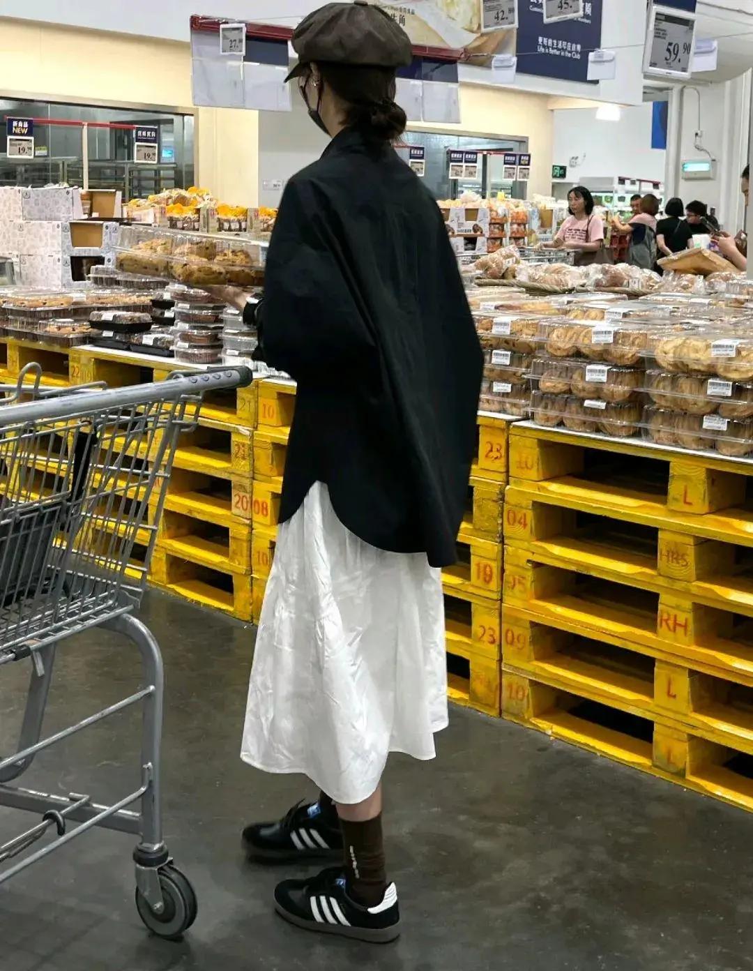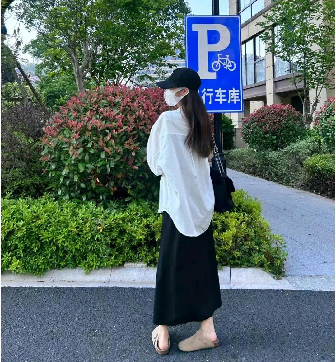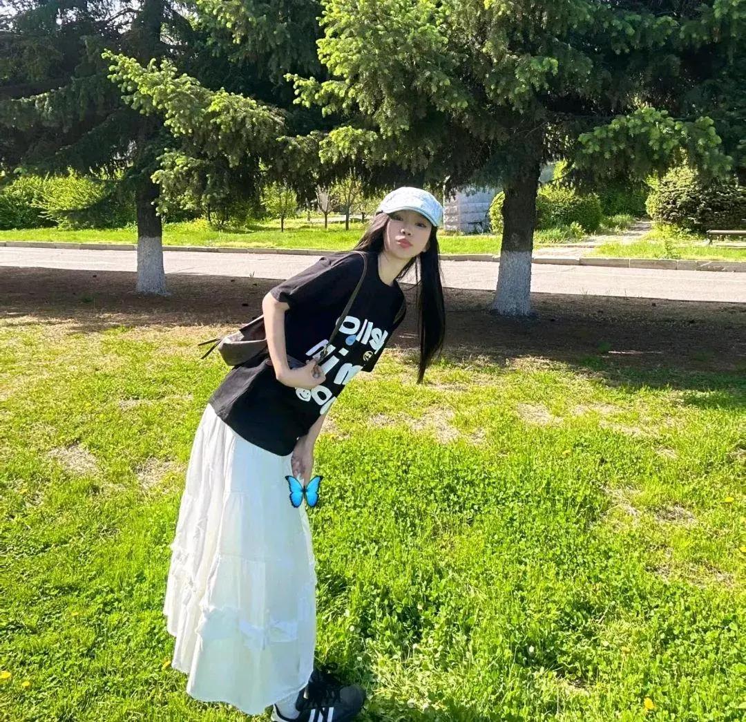 真的超喜歡這一套的,黑白配組合,真的一點都不挑人的,黑色寬鬆t 恤配白色半身長裙,這一身我看着就超級喜歡的,不僅顯溫柔,還帶着一種隨性,結合起運動鞋和棒球帽後,就能打造出青春氣息。