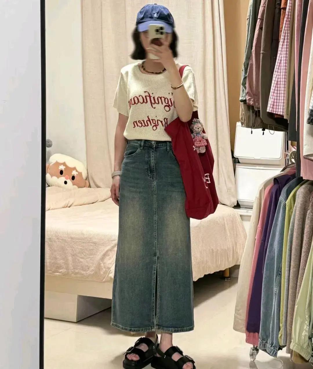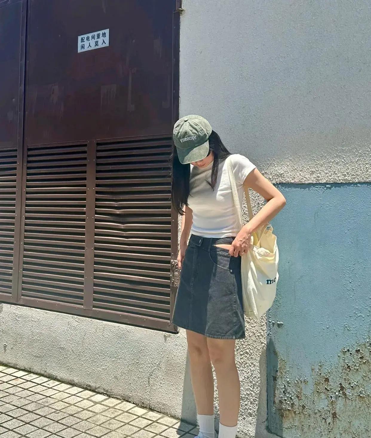 155穿也很不錯的一套穿搭,夏天出門就這麼穿吧,基礎款短袖t 恤配牛仔直筒半身長裙,腳上踩着一雙厚底涼鞋,這樣穿可太舒適了,記得佩戴起一頂棒球帽,青春又不失活力。