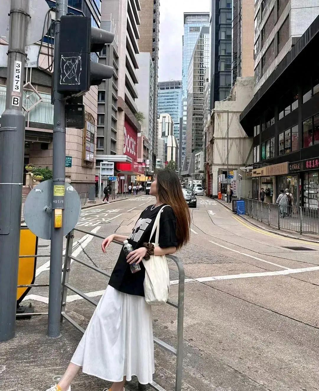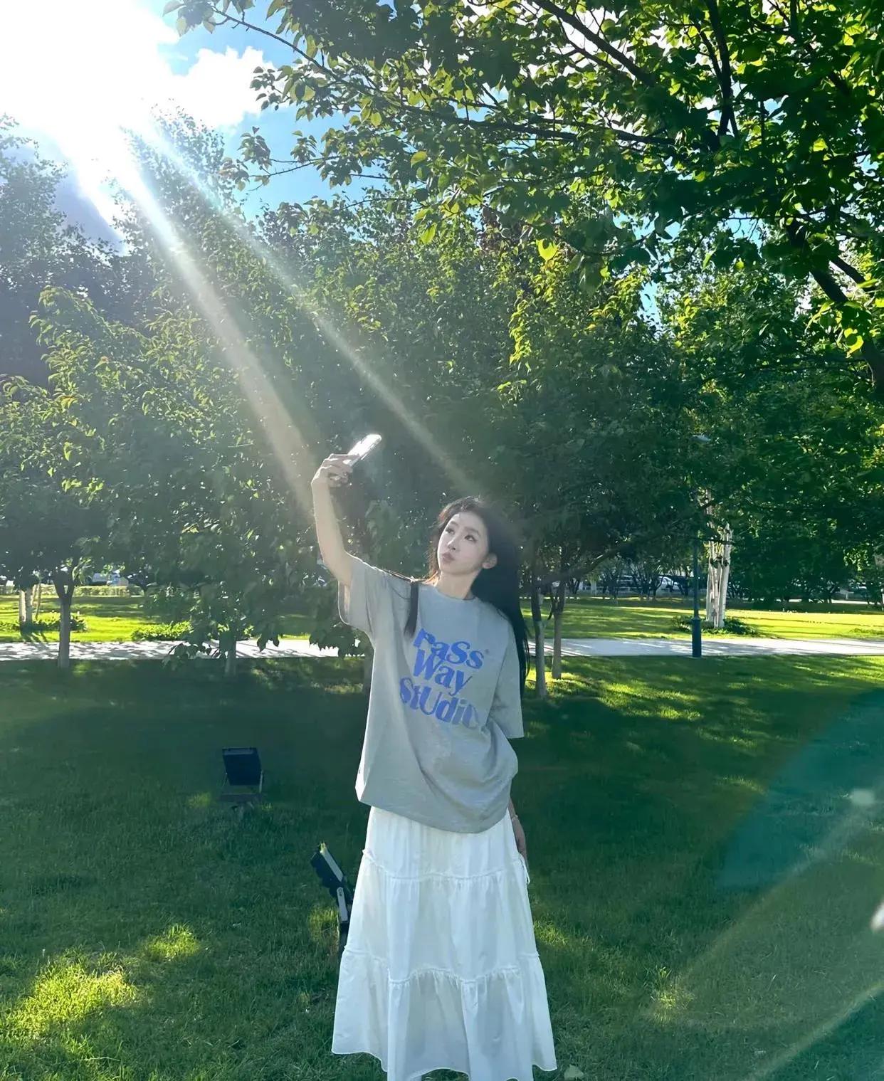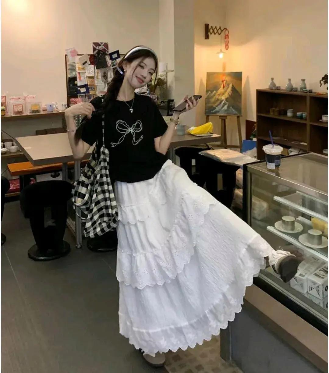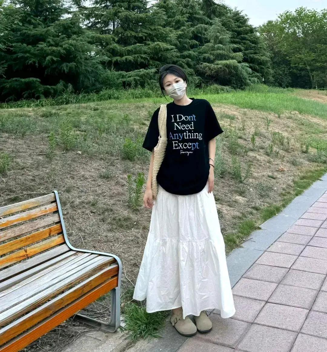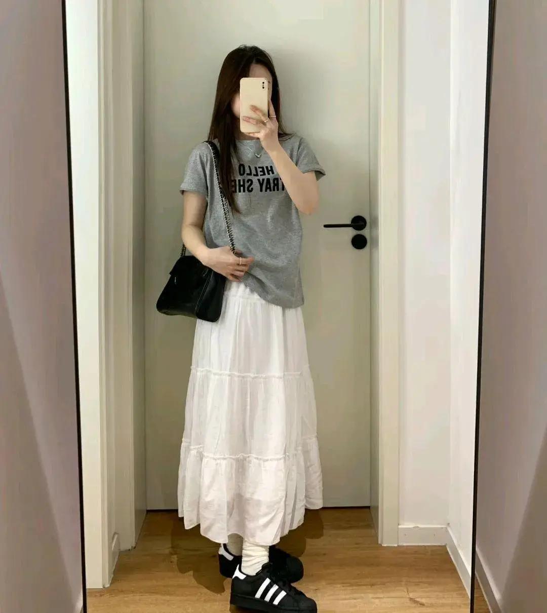 黑色短袖配白色半身長裙,這樣的搭配看起來也太般配了,這麼一條小白裙,超級溫柔的,上短下長的組合,可以輕鬆優化整個身材比例,一整個韓系的風格,白色運動鞋的加入,瞬間提升了整個造型時髦度,可太休閒舒適了。