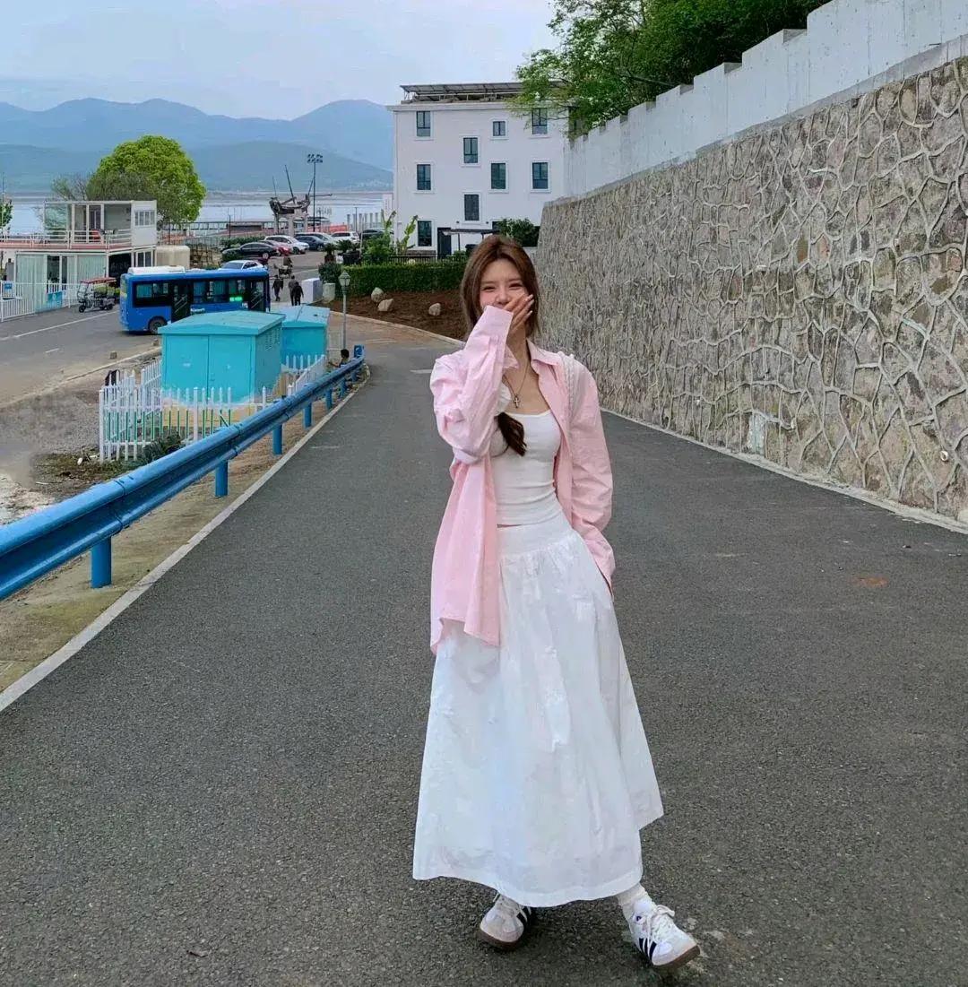 粉色襯衫配白色半身長裙,這樣的配色也太適合夏天了,很顯嫩又減齡,少女範十足。