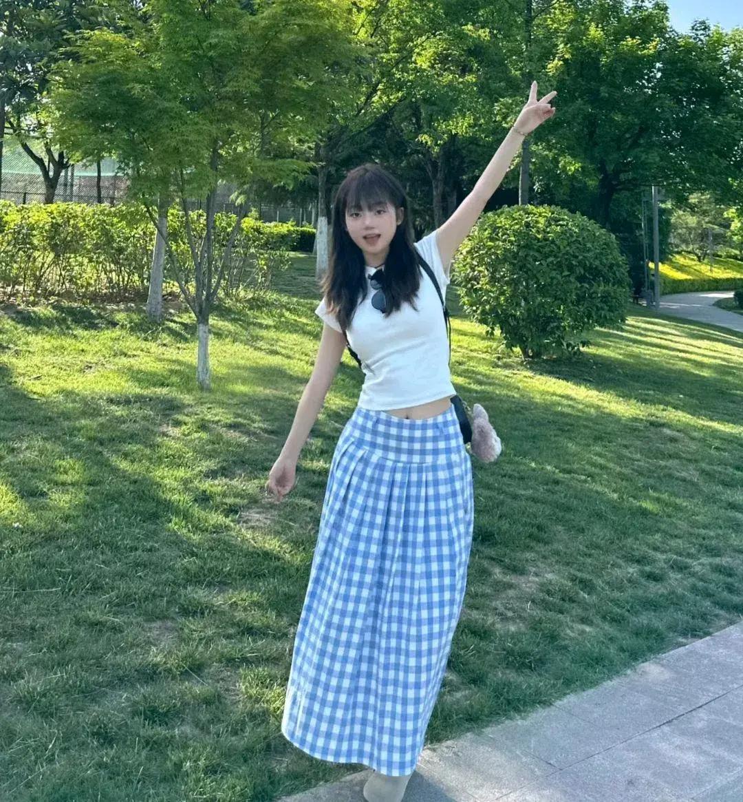 藍白配色組合,真的太適合夏天了,視覺上也有着很好的降溫效果。淡淡的藍色格子半身長裙,直筒的裙身,對身材起到很好的包容性,上短下長的搭配,輕鬆優化整個身材比例,小個子女生也可以輕鬆駕馭。