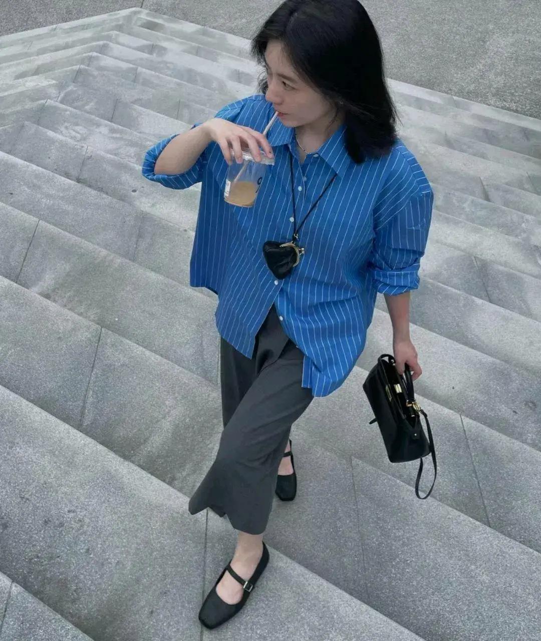 很適合上班通勤的穿搭,也可以在逛街的時候穿,藍白條紋襯衫,喜歡它這種寬鬆的版型,太藏肉顯瘦了。