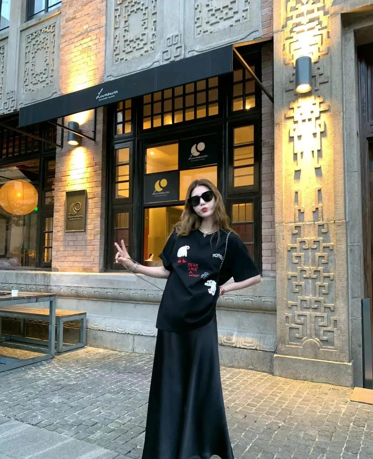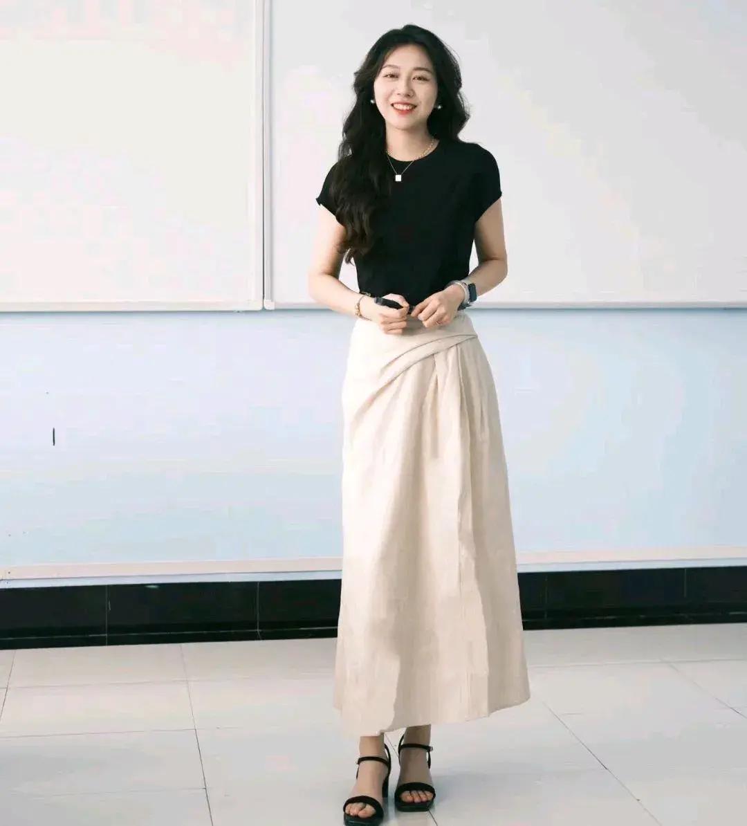 體內製的穿搭也可以大大方方的好看,簡單的黑色短袖t 恤配棉麻半身長裙,直筒版型的裙子,實在是太藏肉和顯瘦了,小個子女生穿記得要把腰線提高起來,這樣纔不會拉低個子。選擇一雙黑色一字帶涼鞋,真的很顯氣質。