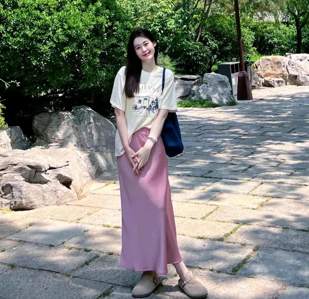 乾淨清爽過夏天就對了,在夏季的搭配,簡簡單單就好了。白色短袖t 恤配粉紫色緞面半身短裙,不僅遮肉還非常好看。選擇一雙勃肯鞋來配,讓整個穿搭看起來又多了幾分隨性。