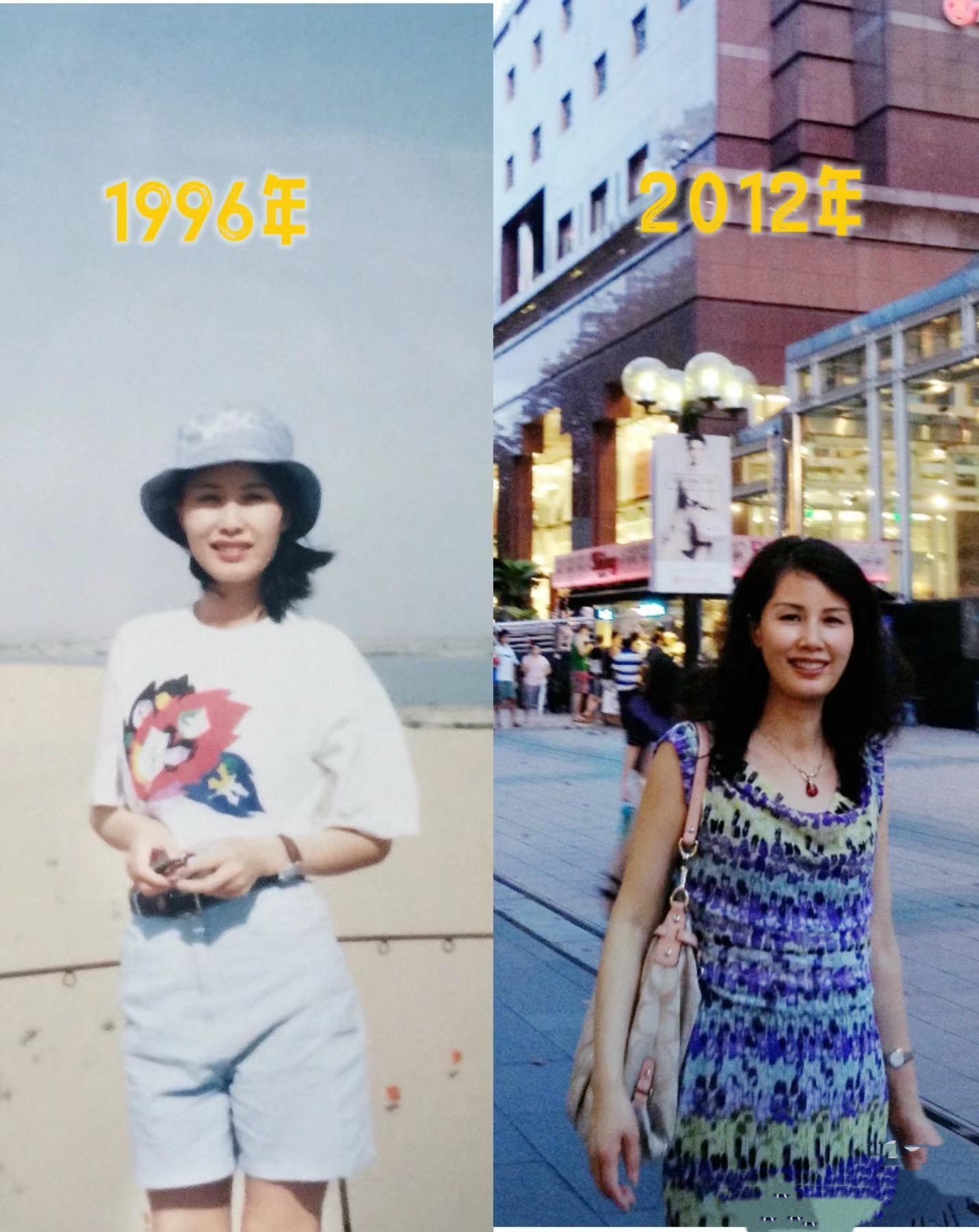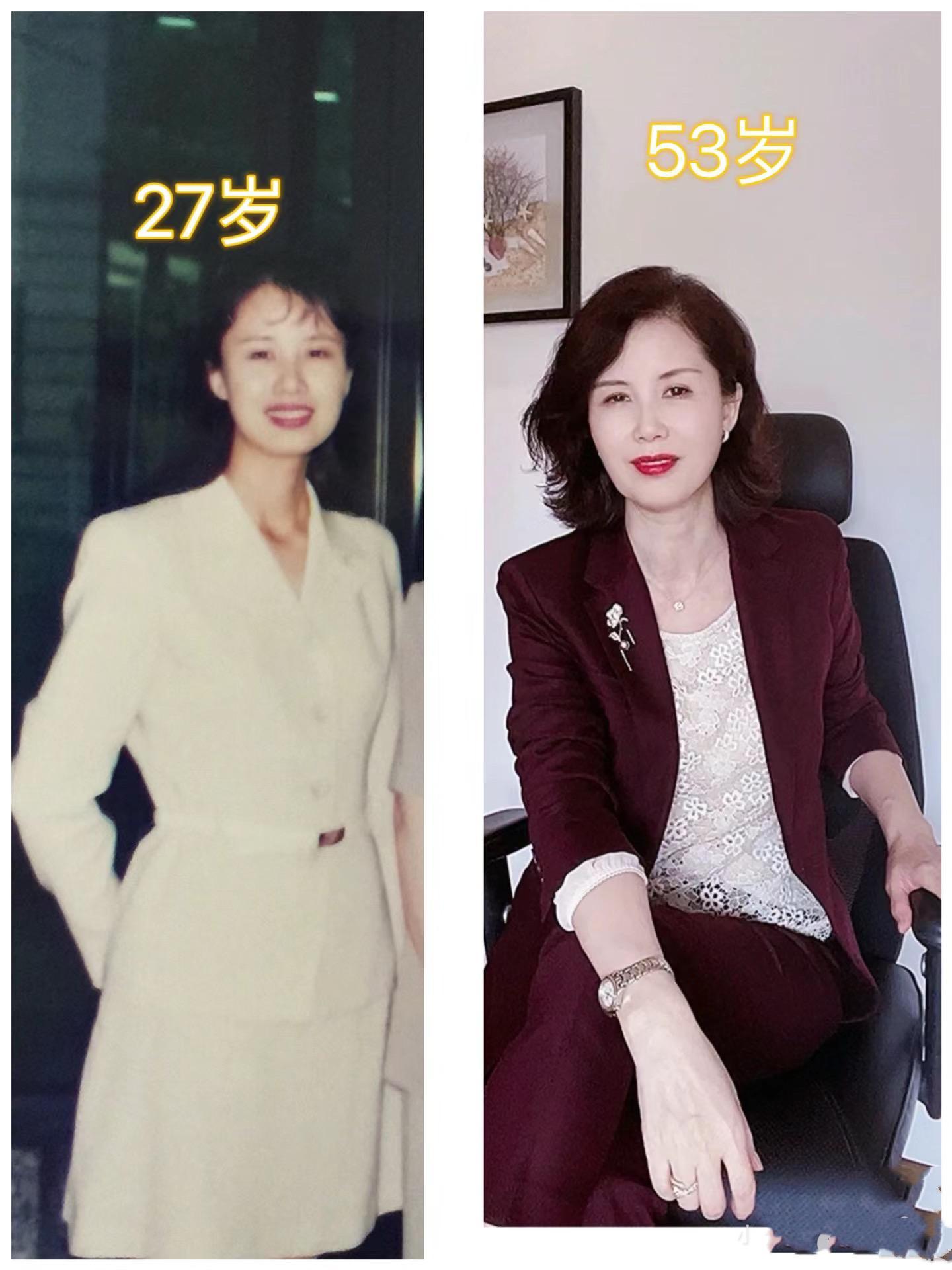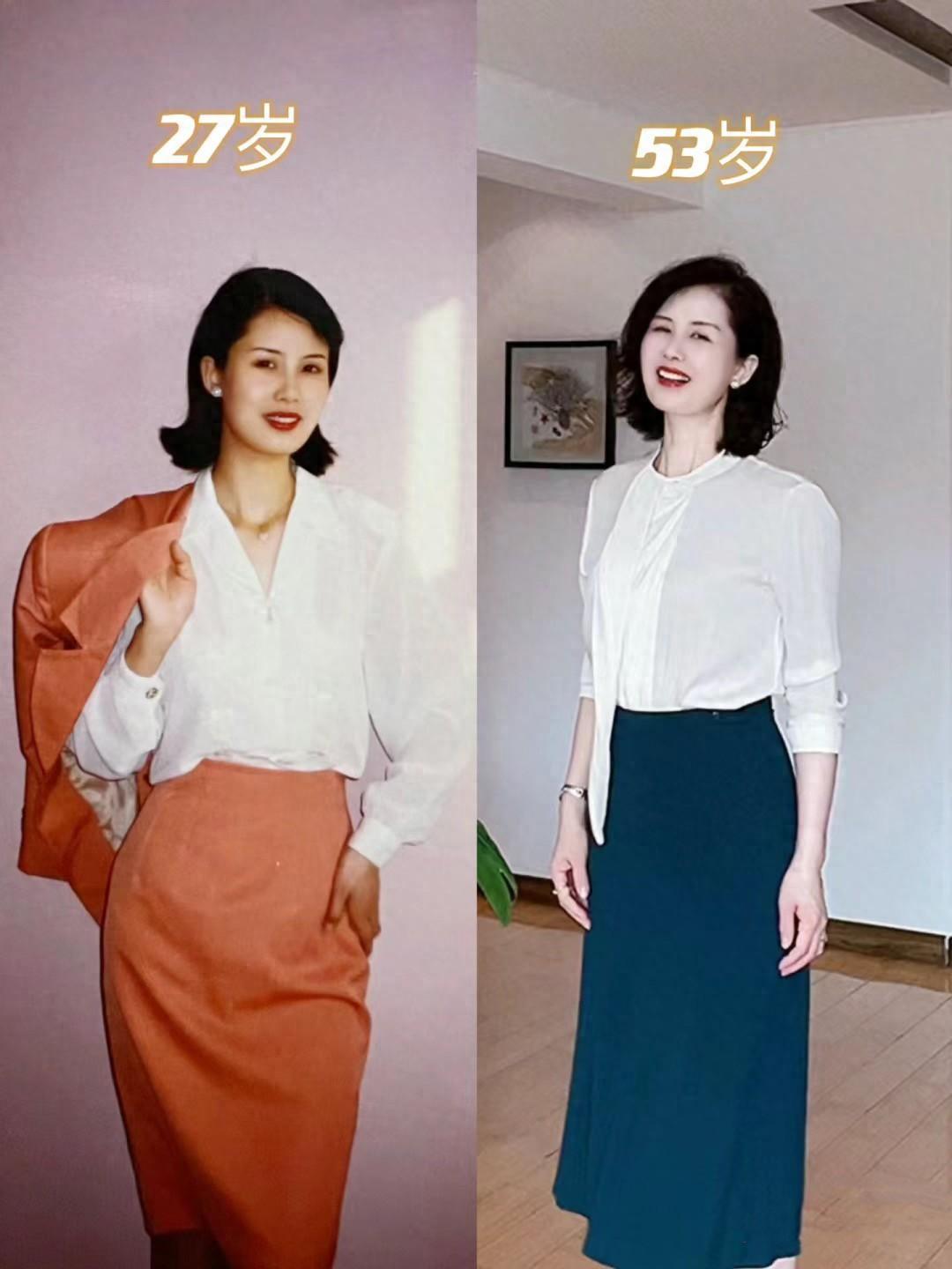 27歲VS53歲,幾乎是同款的衣服,相似的身材。