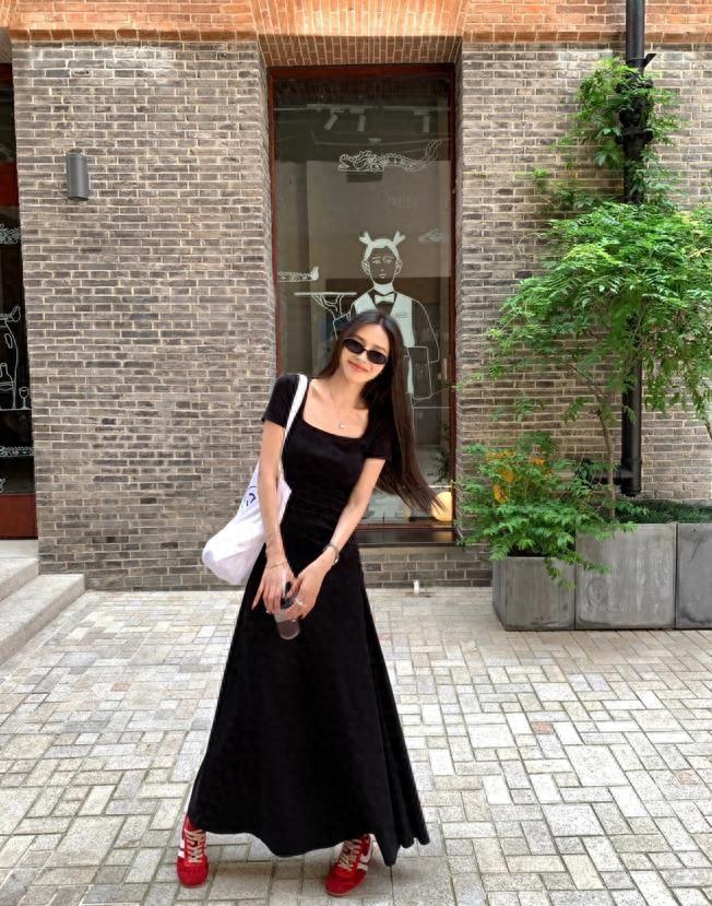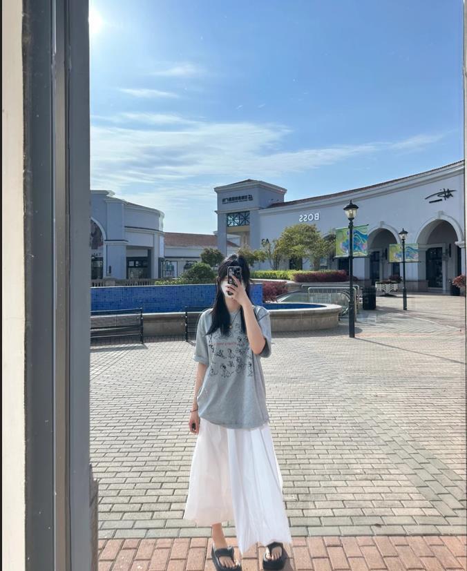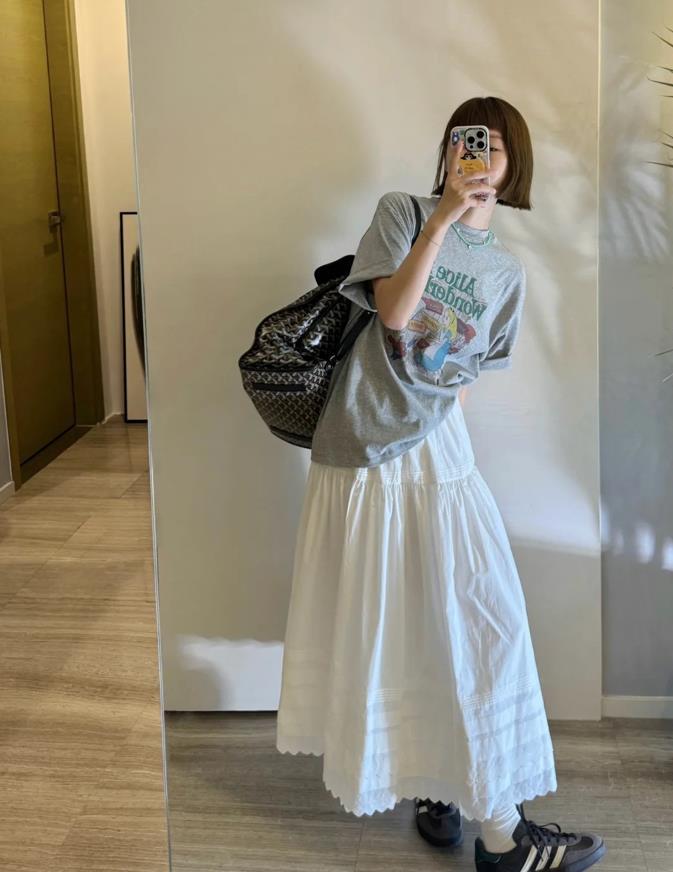 喜歡鬆弛感穿搭的姐妹,說什麼也要試試這一套,灰色短袖t恤和白色半身長裙,都是寬鬆的版型,所以對身材沒有一點約束感,組合在一起後,就會給人一種隨性自在感,搭配起一雙運動鞋,整個人看着就十分年輕。