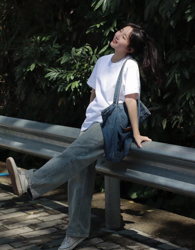 這一件白色t恤看起來真的太不錯了,面料和版型都很不錯,穿起來舒適度也太讚了,選擇一條牛仔闊腿褲來配吧,這種褲子對於腿粗、腿型不好的身材最友好了,一整個顯瘦和舒適。