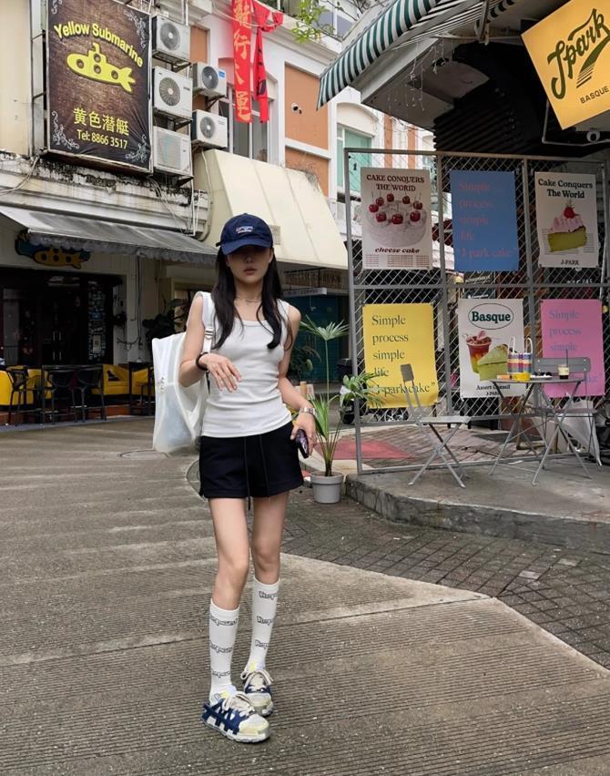 在夏天,還得是背心啊,當然,前提是你有着完美的身材比例,這一件寬肩的背心,肩寬的女生也是可以穿的,搭配了一條黑色半身短裙,這也太清爽涼快了吧?小個子女生也能打造出大長腿的既視感。