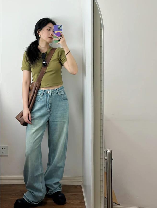 上短下長的搭配,對於身材就是有着極佳的優化效果,修身的短款t恤,小個子女生也能輕鬆駕馭,搭配寬鬆高腰牛仔褲,這麼一套真的是梨形身材的最愛了,顯瘦又能拉長腿部線條。