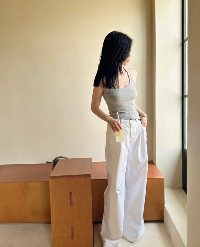 灰白配色,真的是非常時髦和百搭啊,反正這兩種色調都是屬於經典色,組合在一起自然是沒有任何違和感的。灰色背心搭配白色闊腿褲,這麼穿很清爽涼快又不失小性感。