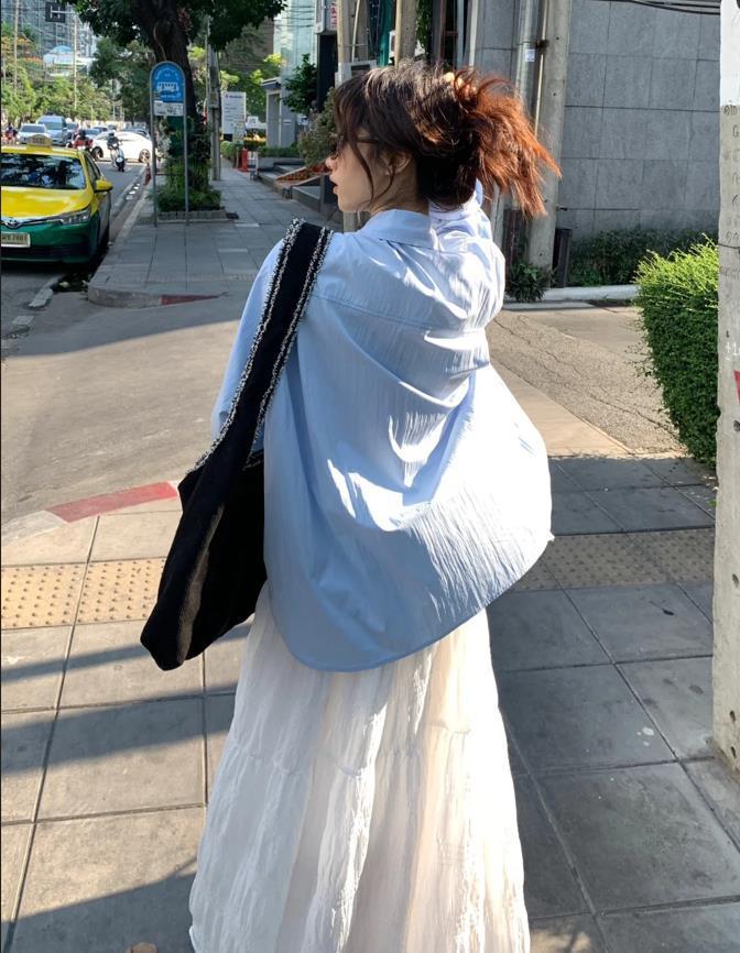 真的是巨好看的白色半裙,記得在選擇長度上,要入手長一些的纔好,輕盈的材質,不僅透氣性好,還很舒適自在。寬鬆的裙身,有助於隱藏起身上的缺點,搭配藍色襯衫,藍和白的配色,就是自帶降溫效果。