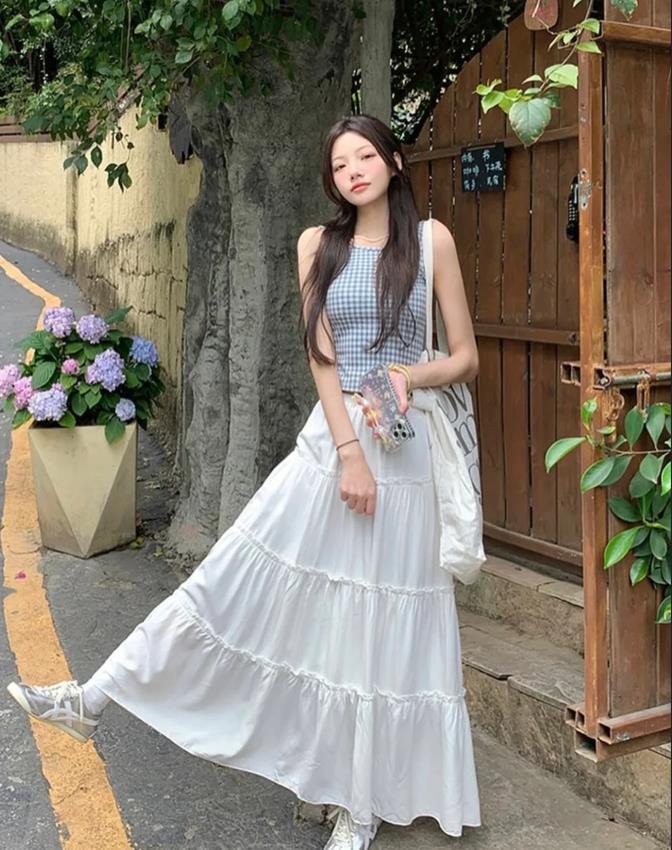 充滿夏日小清新的一套穿搭,看起來也太溫柔了,藍白小格子無袖背心,自帶小清新和俏皮氣息,選擇白色半身長裙來配,純淨的白色,就是能讓人看起來很溫柔。上短下長的組合,小個子也可以駕馭。