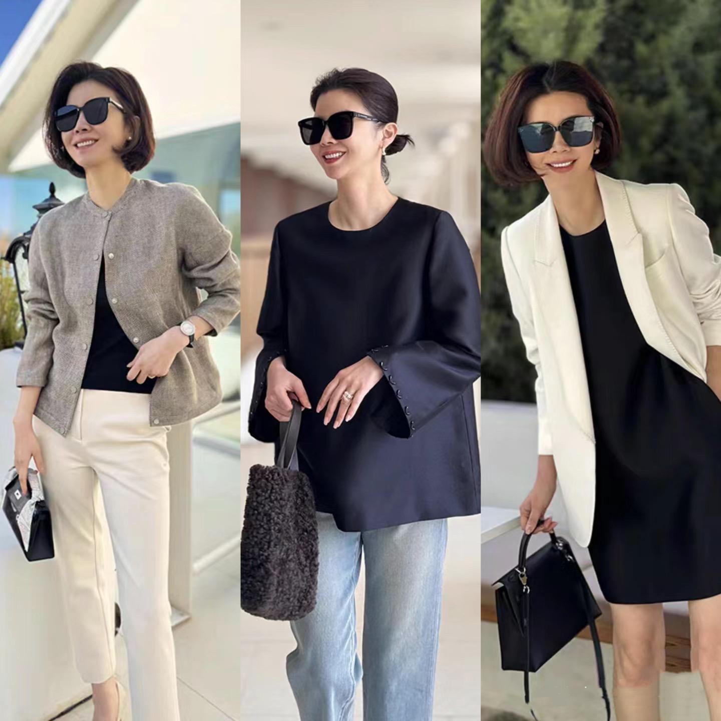 比如黑色修身連衣裙,擁有更極致的優雅。配白色的西服外套,更多了簡單清爽的高級範。白色西服長款的設計,更多了大女人的強勢美。