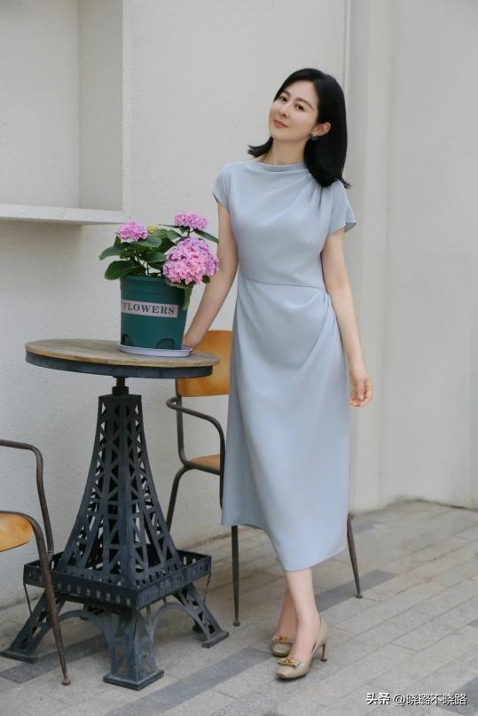 成熟女性選擇裙裝的長度,建議超過膝蓋。一方面是可以修飾我們的腿型,掩蓋腿不直的問題。另一方面也能更好的遮肉顯瘦,削弱我們的身材問題。選擇天藍色的襯衫結合高腰的直筒裙,會達到視覺上的平衡,同時又顯得身材纖細,高挑感十足。