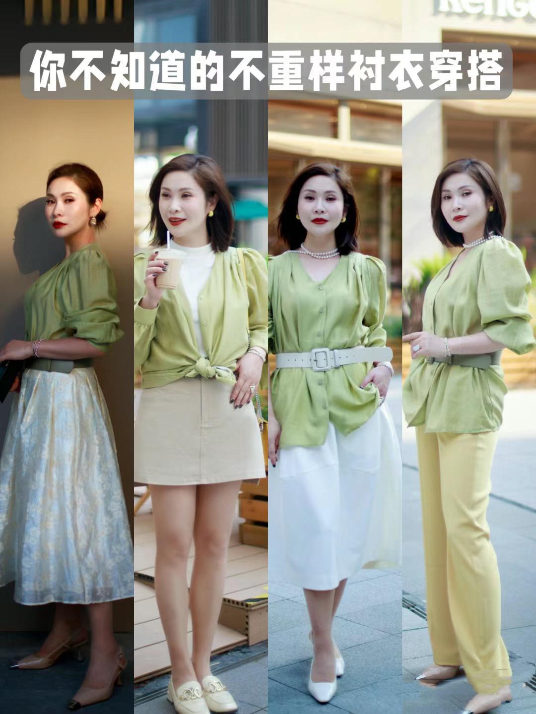 像這種淺綠色的襯衫,我們可以配白色、或者鵝黃色,都呈現出輕盈乾淨的效果。淺綠色襯衫,很顯膚色、也很顯白。