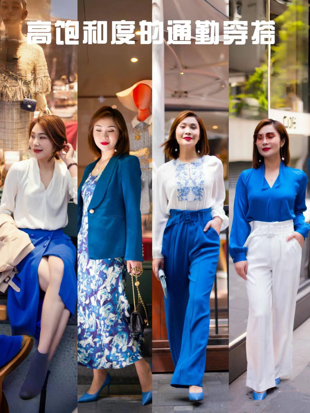 比如高亮度的克萊因藍,我們可以選擇藍色襯衫、或者藍色西裝褲、藍色半身裙,甚至是藍色高跟鞋。藍色高跟鞋撞上藍色單品,有一種醒目又不誇張的美。