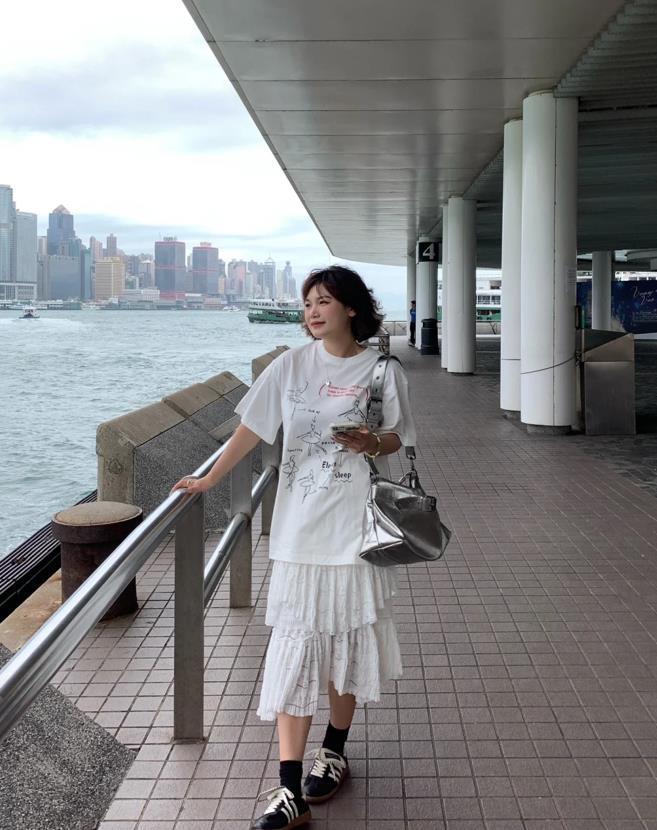 一身白色系的搭配,視覺上就具有很好的降溫效果,清爽又不失乾淨,白色蕾絲半身長裙,很適合夏天穿,搭配同樣是白色的短袖t恤,寬鬆的版型,穿得可舒適自在了,腳下踩着一雙運動鞋,有些鬆弛還不失隨性的一套。