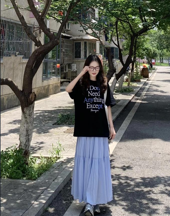 喜歡藍色,這不是沒有理由的,因爲這個顏色真的太襯膚色了,也非常適合在悶熱的夏季裏穿,這一條藍色半身長裙,不就是爲夏日而生的麼?長款的裙子,可太藏肉顯瘦了,搭配黑色短袖t恤,一整個鬆弛隨性。