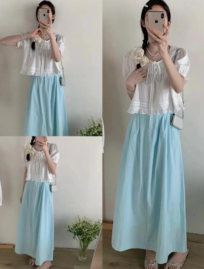 沒有人看到這一套穿搭會不喜歡的吧?充滿甜美氣息的短袖小上衣,自帶俏皮與可愛氣息,下面是一條水藍色半身長裙,不僅遮肉顯瘦,還滿滿的活力氣息,很亮眼。