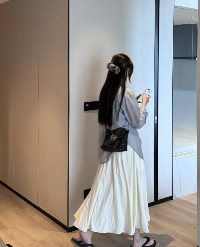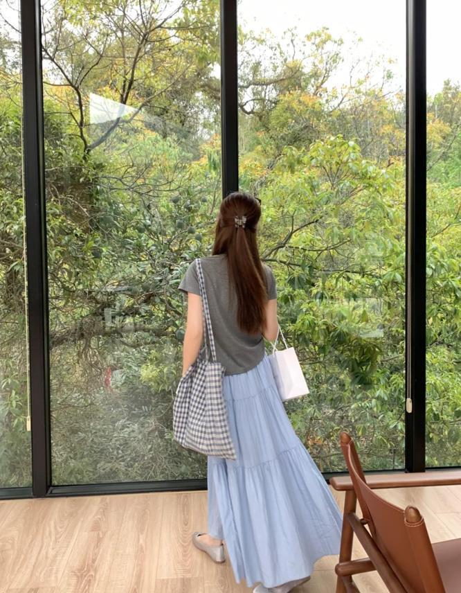 Baby藍色的半身長裙,真的太喜歡了,上衣選擇了一件淺灰色短袖t恤,這兩種顏色組合在一起,這樣穿乾淨又清爽,逛街、出遊或者是上班的時候,都可以這麼穿,時髦感輕鬆拿捏住。