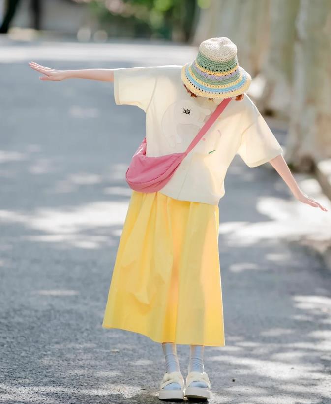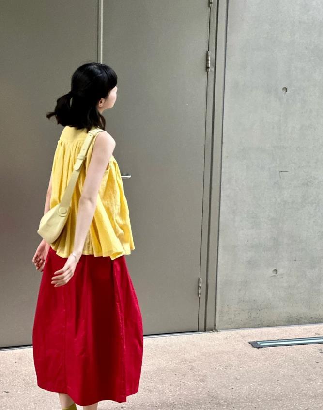 給夏天一點亮色吧,清爽的檸檬黃色半身裙,猶如一顆行走的檸檬,真的太明亮動人了,也十分洋氣。寬鬆休閒的款式,最藏肉顯瘦了,上衣可以配t恤,或者是襯衫,都是可以的。