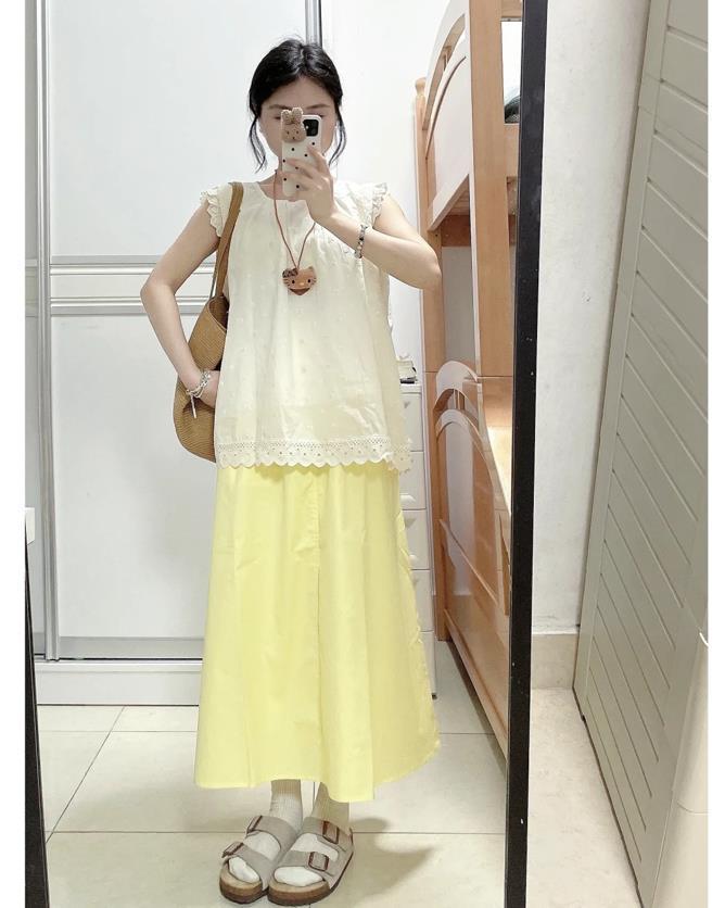 150小個子女生也適合的一套,很清新明亮的裝扮,米色蕾絲小衫,寬鬆的版型,完全不挑身材的,可以讓你穿得很舒適自在,也顯瘦。奶油黃的半身長裙,瞬間多了幾分溫柔和可愛氣息。