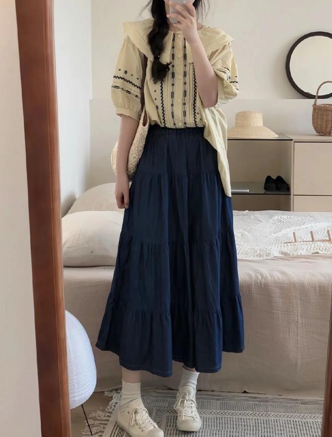 娃娃領的中袖襯衫,第一眼就愛上了,比起基礎款,我更喜歡這種充滿細節感的款式,加上寬鬆的版型,也太藏肉顯瘦了。下身配上一條藏藍色半身長裙,長度剛剛好,很顯瘦也顯腿長,這麼一套搭配無論是約會,還是上班通勤,都能輕鬆hold住。