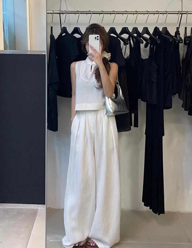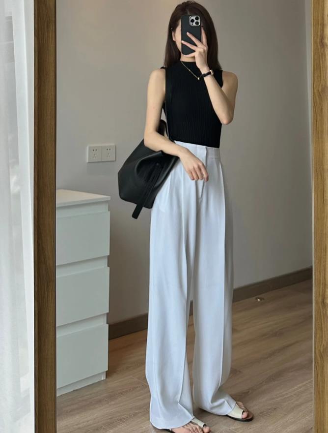 黑色無袖背心+白色西裝闊腿褲,黑白配也太經典和時髦了,垂墜感十足的白色西裝闊腿褲,無論你是什麼身材,基本都可以駕馭起來。腰間可以增加一條腰帶進行點綴,有助於修飾身材比例,也更顯瘦。