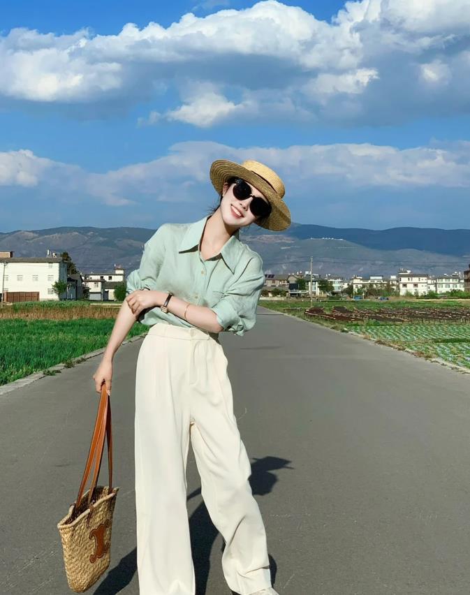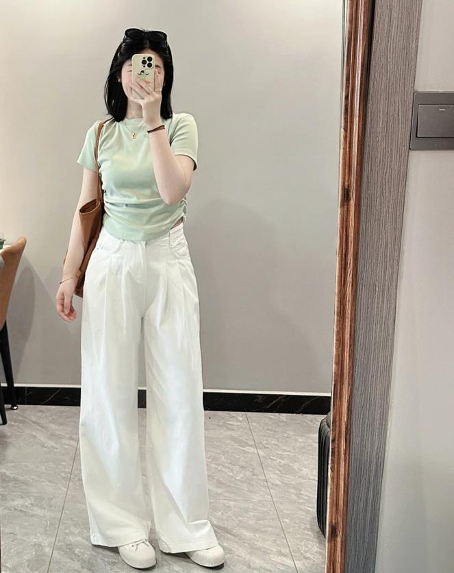 身高一米五也可以穿的西裝白色闊腿褲,因爲只要把腰線提高起來,加上褲子本身極佳的垂墜感,誰都可以打造出大長腿。乾淨的白色,自帶清爽和降溫的效果,配上一件淺綠色襯衫,實在是太清新了。